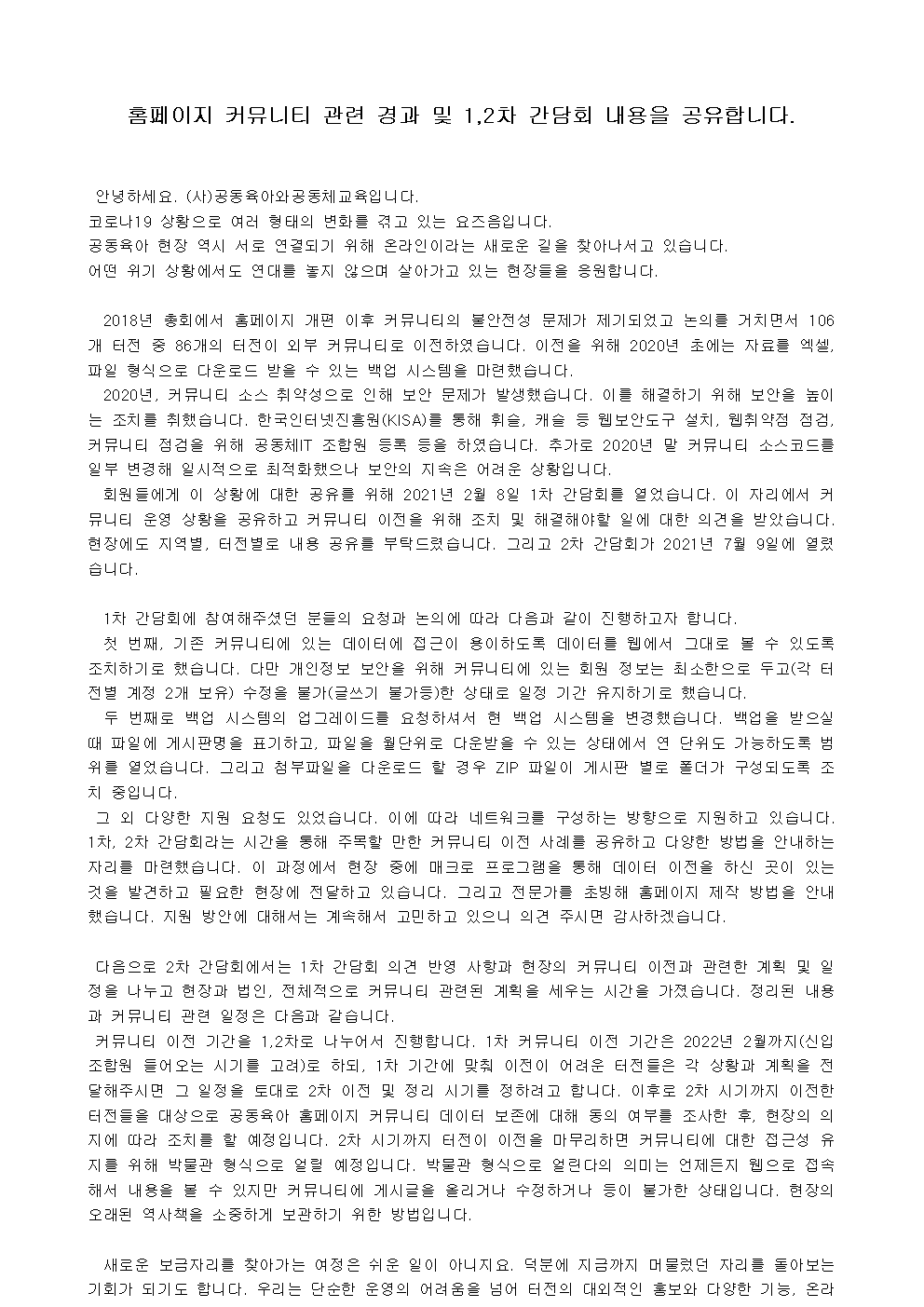 홈페이지 커뮤니티 관련 경과 및 1,2차 간담회 내용을 공유합니다.