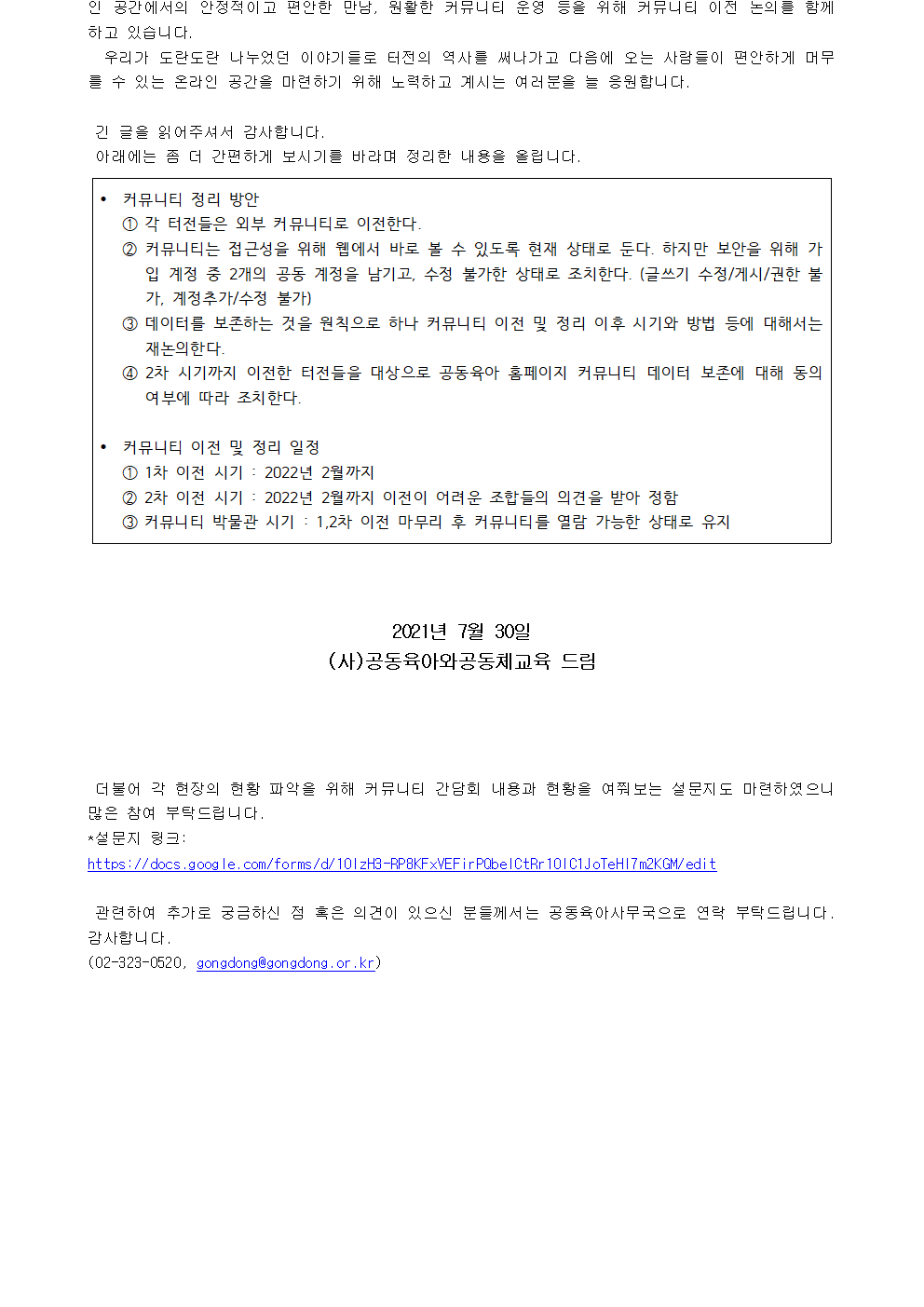 관련하여 추가로 궁금하신 점 혹은 의견이 있으신 분들께서는 공동육아사무국으로 연락 부탁드립니다. 감사합니다.