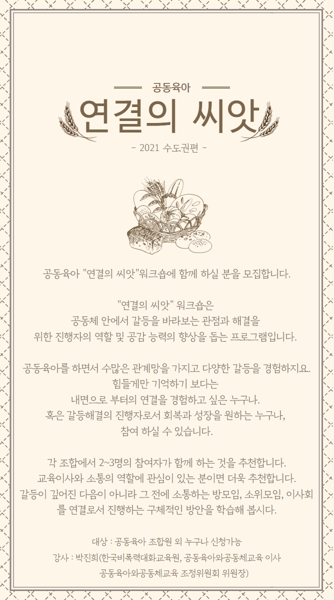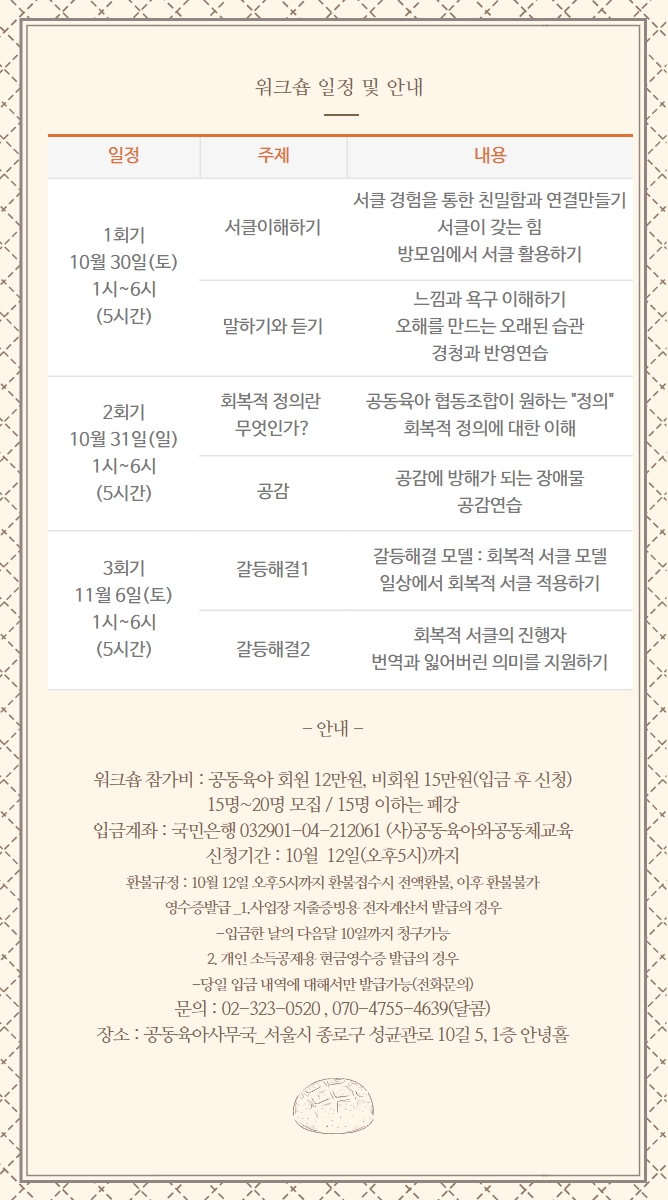 [연장공지]2021년 공동육아 연결의 씨앗(회복적 써클) 워크숍 안내_공동육아조정위원회 페이지 정보 작성자 운영자 작성일21-08-24 18:12 조회1,536회 본문 참가신청은 여기에서 ---> https://forms.gle/FeiGxERUwTkD9oov6 댓글목록 운영자님의 댓글 운영자 작성일 21-10-13 11:17 본 공지는 10월 25일(월)까지 연장합니다. <p><span style="font-size: 12pt;">본 공지는 10월 25일(월)까지 연장합니다.</span></p> 이전글 다음글 목록