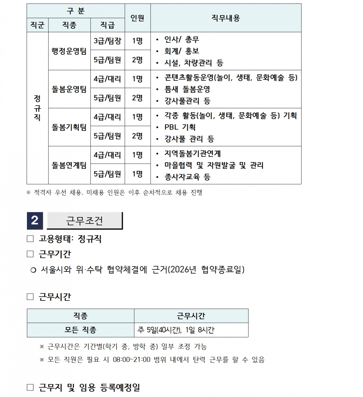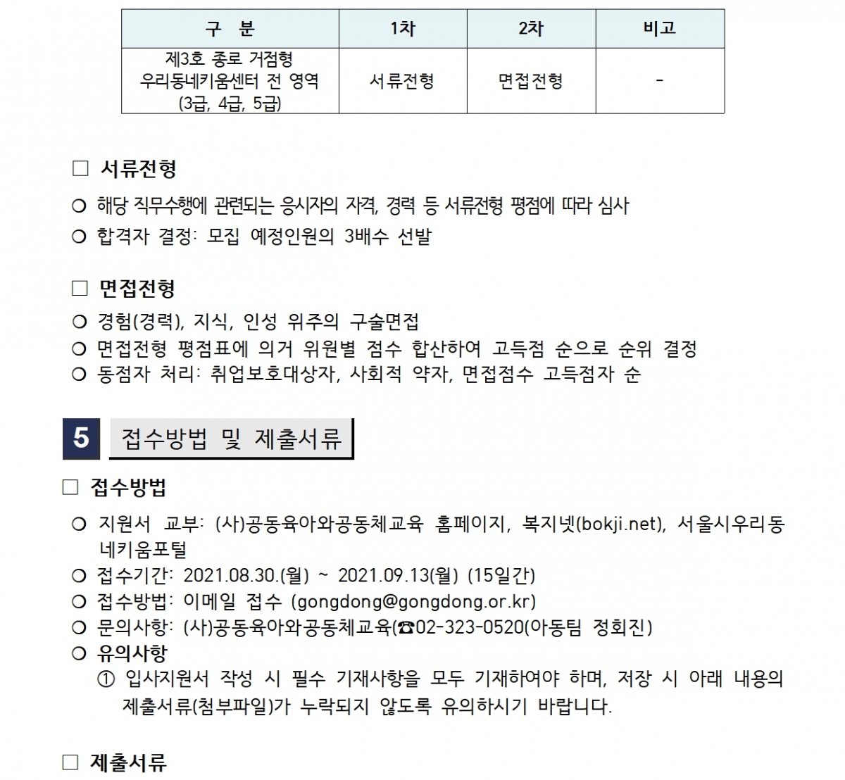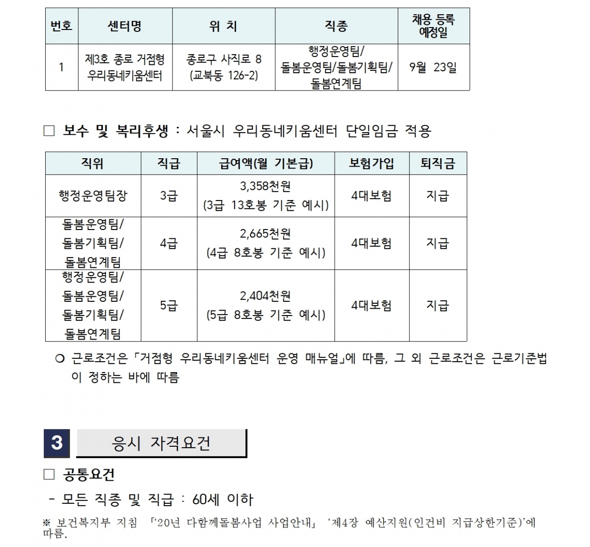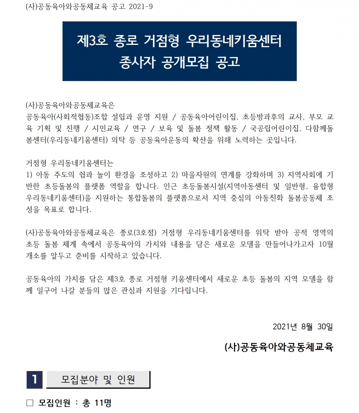 제3호 종로 거점형 우리동네키움센터 종사자 채용 공고(~9월 13일, 11명)