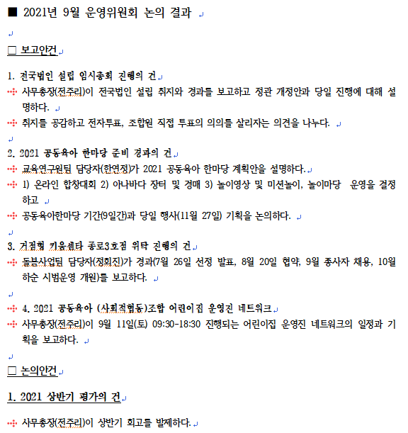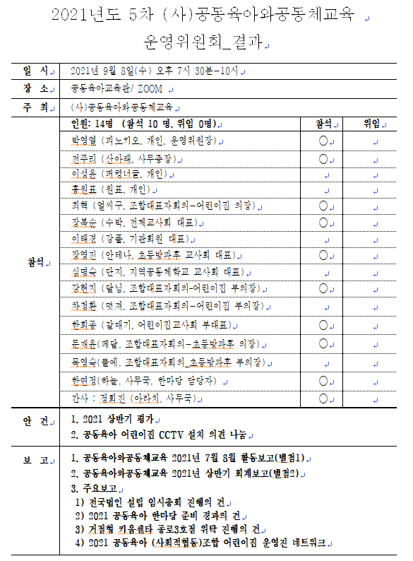 (사)공동육아와공동체교육 2021년 9월 (8일) 법인운영위원회 회의 결과 공지드립니다.