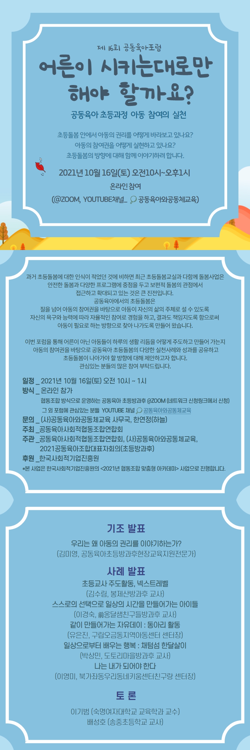 [제16회 공동육아포럼] 어른이 시키는 대로만 해야할까요? 페이지 정보 작성자 운영자 작성일21-09-28 16:53 조회1,221회 본문 댓글목록 등록된 댓글이 없습니다. 이전글 다음글 목록