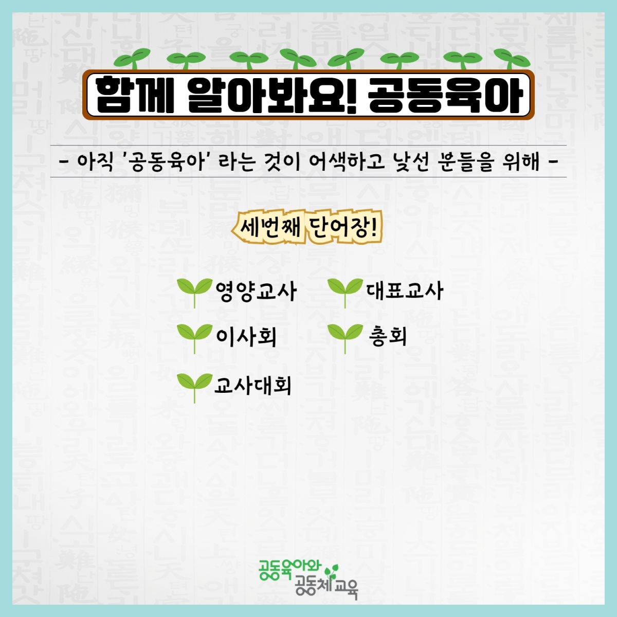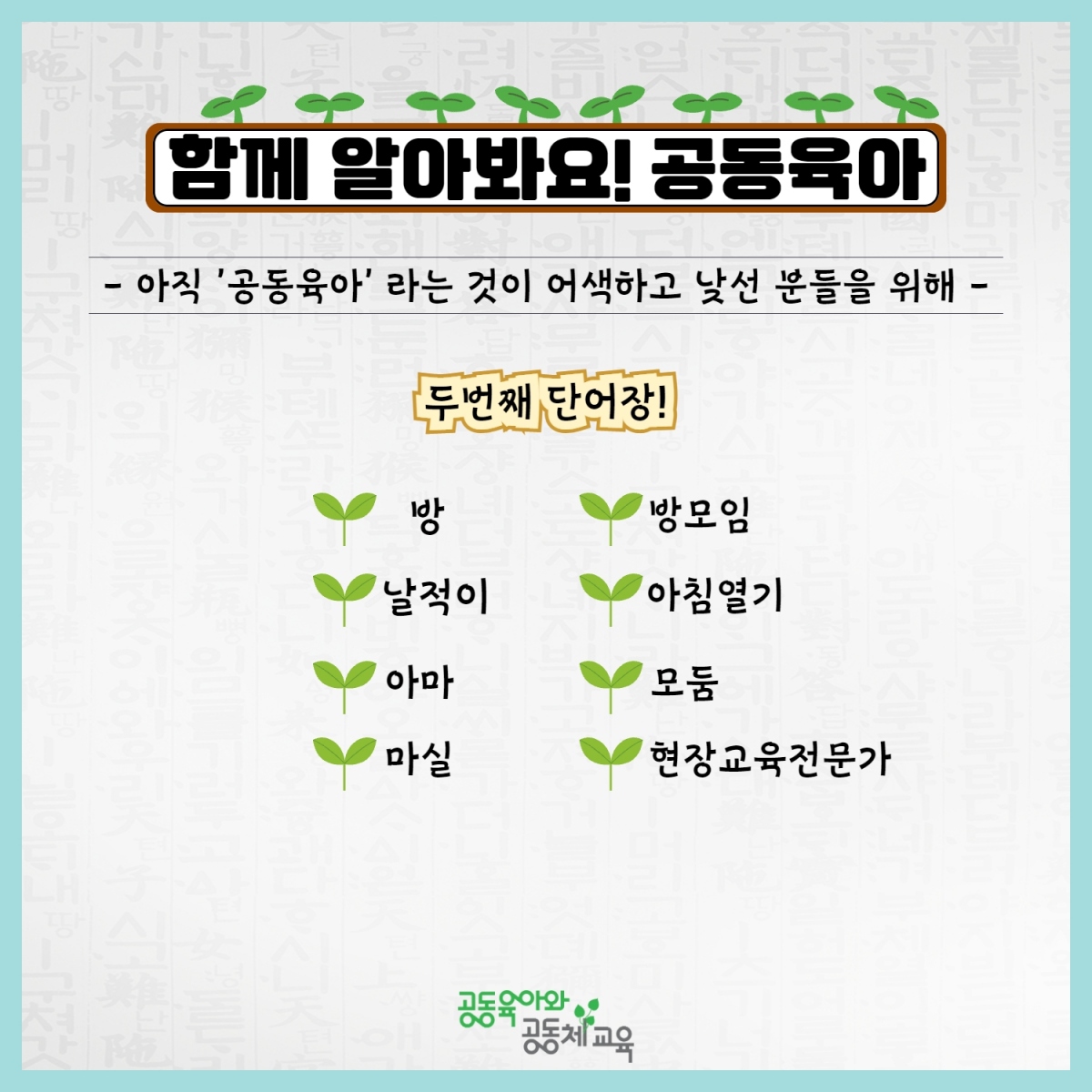 공동육아 현장에서 자주 쓰이는 단어와 단어가 뜻하는 정의를 모아서 카드뉴스 형태로 만들어봤습니다.