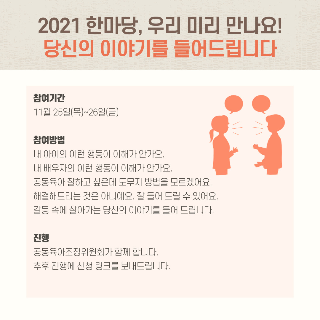2021 공동육아 한마당 차근차근 알아볼까요? 페이지 정보 작성자 운영자 작성일21-11-08 15:16 조회7,542회 본문 댓글목록 운영자님의 댓글 운영자 작성일 21-11-15 12:40 당신의 이야기를 들어드립니다 신청 폼 -->> https://forms.gle/SEEpLcJES8f593aAA <p>당신의 이야기를 들어드립니다 신청 폼 -->> <a href="https://forms.gle/SEEpLcJES8f593aAA">https://forms.gle/SEEpLcJES8f593aAA</a> </p> 이전글 다음글 목록