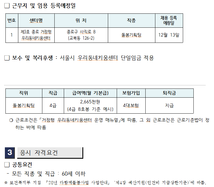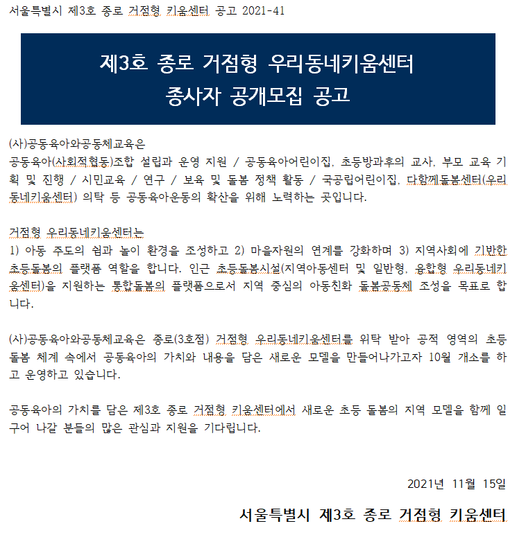 서울특별시 제3호 종로 거점형 키움센터 종사자 채용 공고 (2021년 3차)