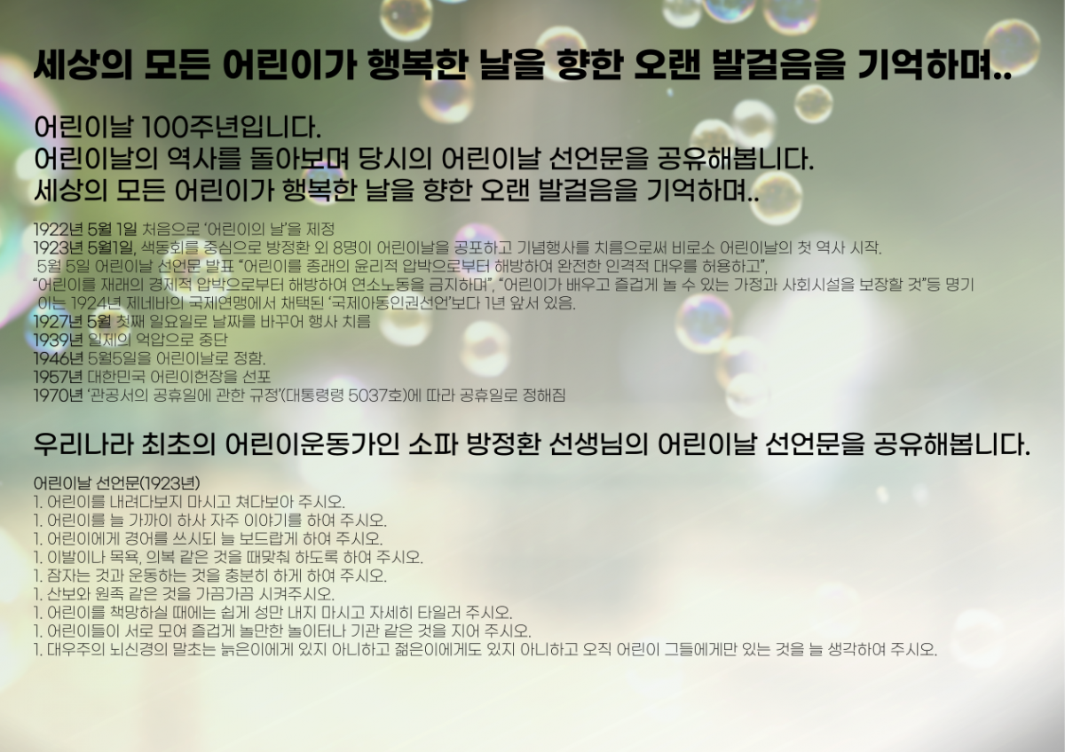 세상의 모든 어린이가 행복한 날을 향한 오랜 발걸음을 기억하며... 페이지 정보 작성자 운영자 작성일22-05-04 16:25 조회1,576회 본문 댓글목록 등록된 댓글이 없습니다. 이전글 다음글 목록