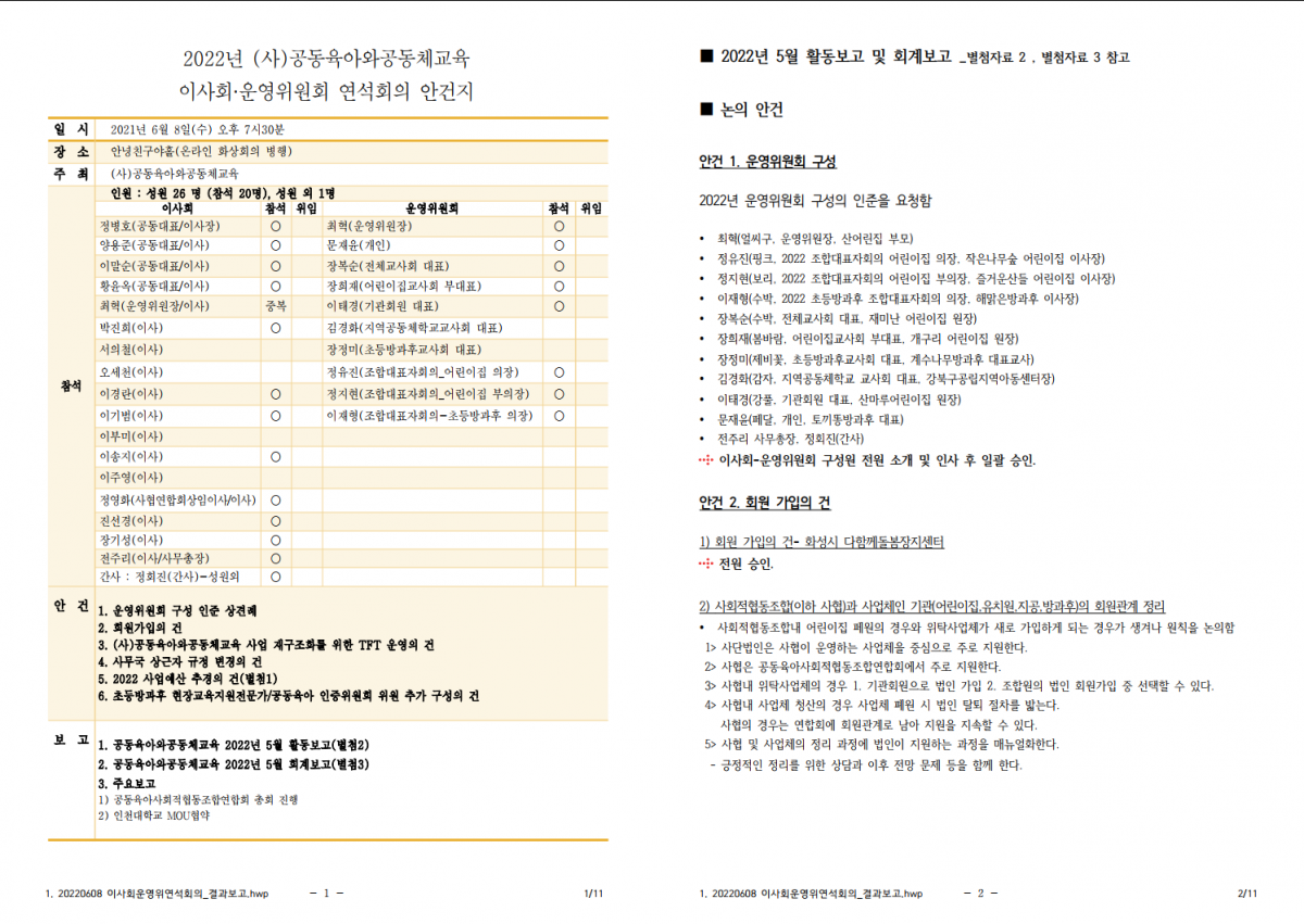 (사)공동육아와공동체교육 6월 이사회-운영위원회 연석회의 결과 보고드립니다. (추경 예산안 별첨/ 5월 활동보고 및 결산보고 …
