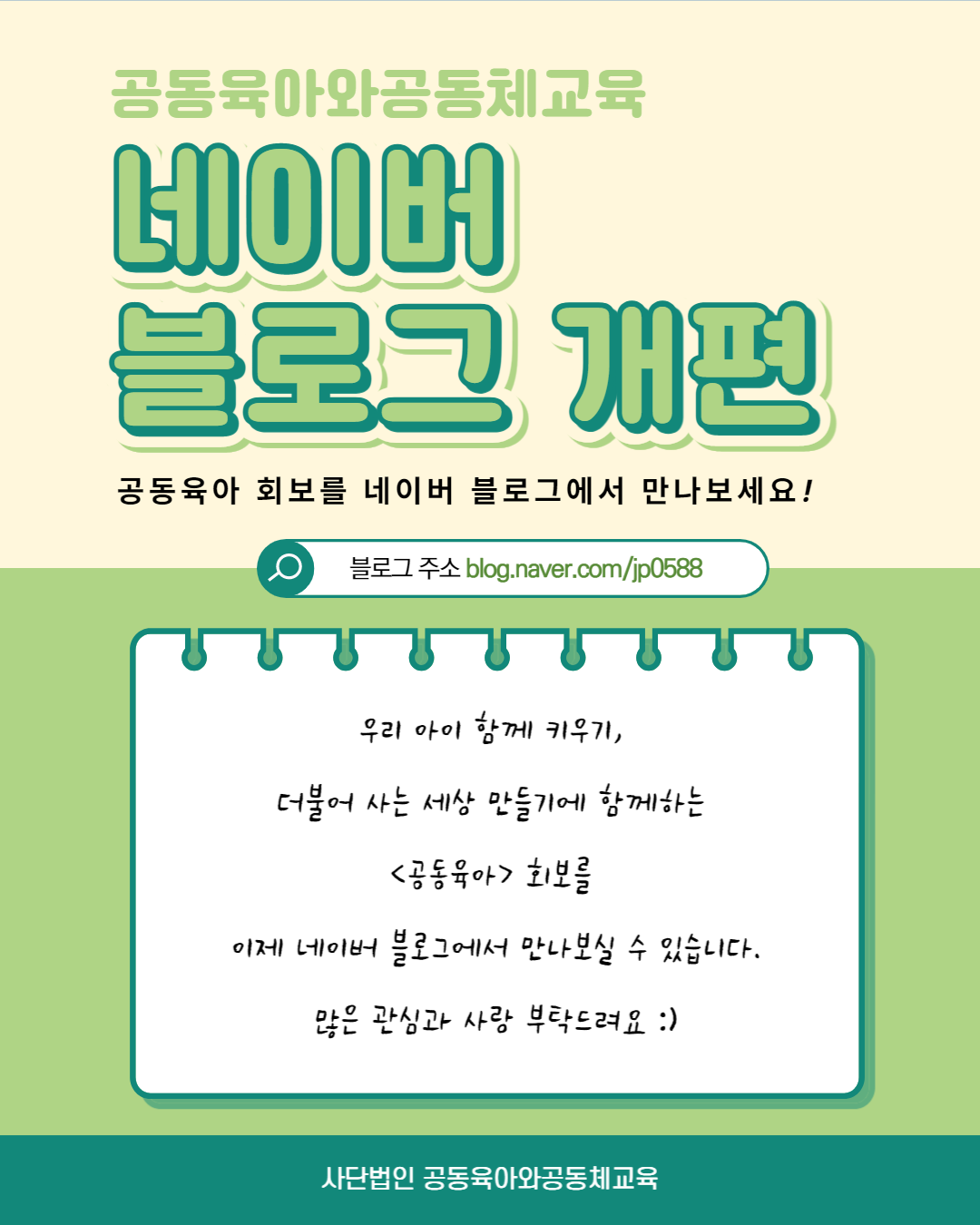 공동육아 회보를 블로그에서 만나보세요 페이지 정보 작성자 운영자 작성일22-07-19 15:51 조회1,043회 본문 공동육아 회보가 매일 블로그에 업로드 됩니다. 많은 관심부탁드립니다 ~https://blog.naver.com/jp0588 댓글목록 등록된 댓글이 없습니다. 이전글 다음글 목록