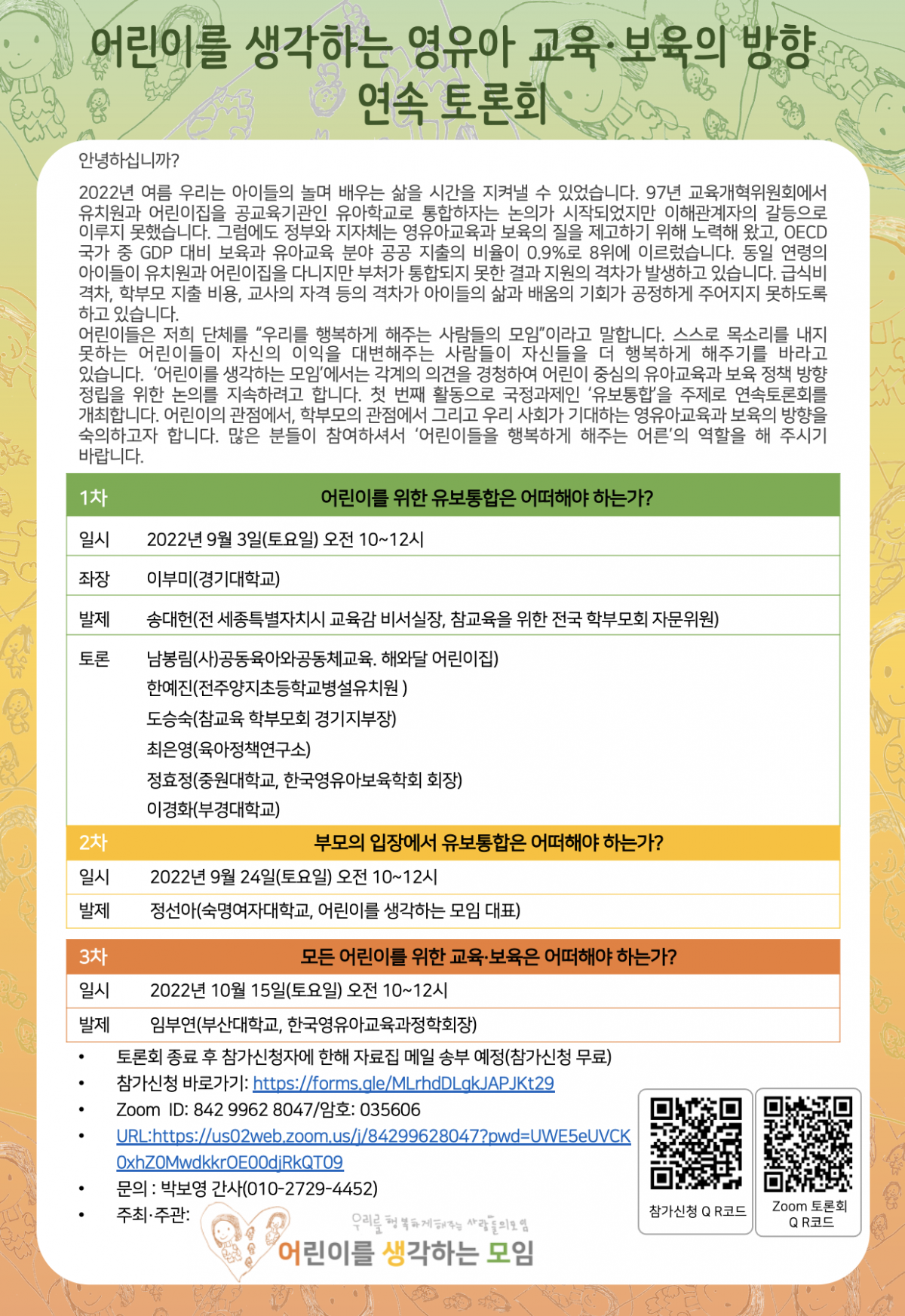 어린이를 생각하는 모임에서 열리는 이번 토론회에서 어린이집과 유치원의 지원격차 통합, 교육내용 통합, 인력 통합의 과정에 대한 방향을 함께 고민하는 자리가 되었으면 좋겠습니다.