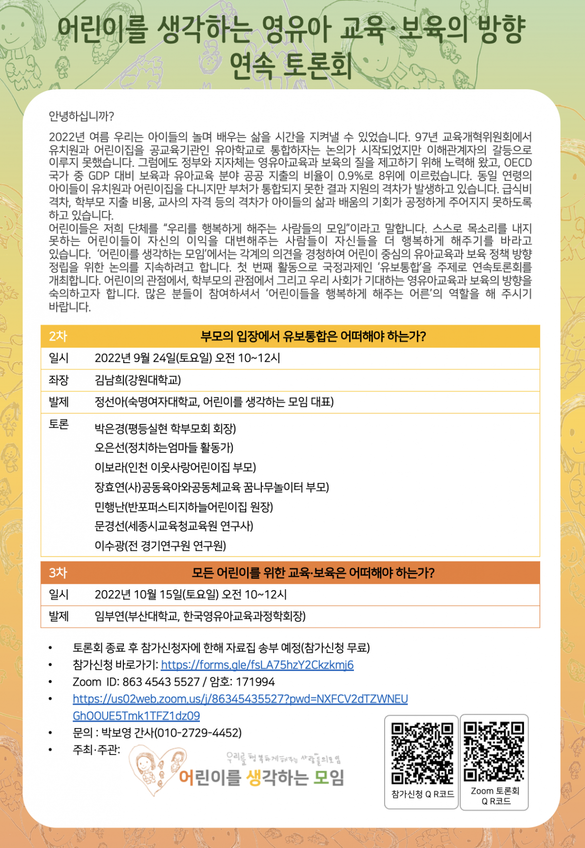 '어린이를 생각하는 영유아 교육 보육의 방향 연속 토론회' 2차 토론회 페이지 정보 작성자 운영자 작성일22-09-14 13:35 조회878회 본문 댓글목록 등록된 댓글이 없습니다. 이전글 다음글 목록