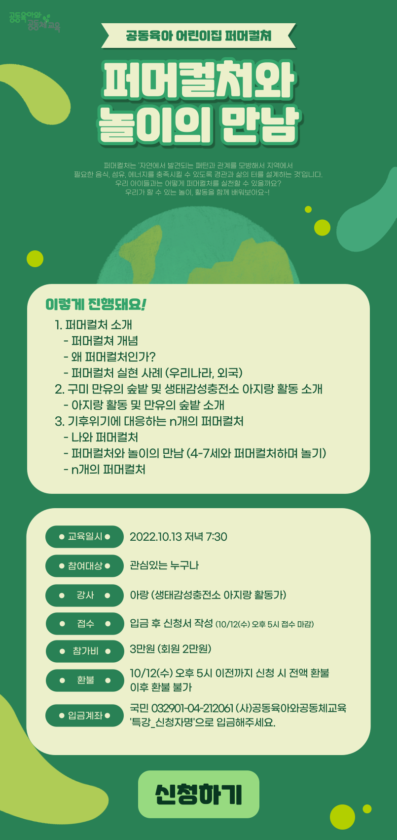 [공동육아교육연구원] 공동육아 특강 '퍼머컬처와 놀이의 만남' 페이지 정보 작성자 운영자 작성일22-10-04 15:58 조회2,704회 본문 댓글목록 등록된 댓글이 없습니다. 이전글 다음글 목록