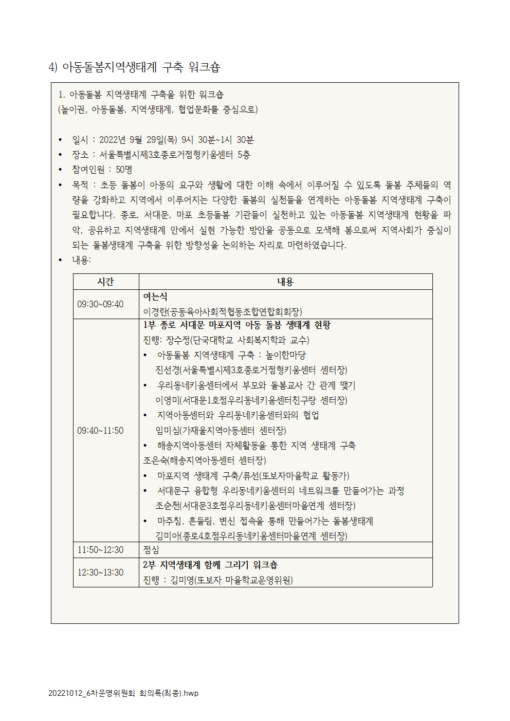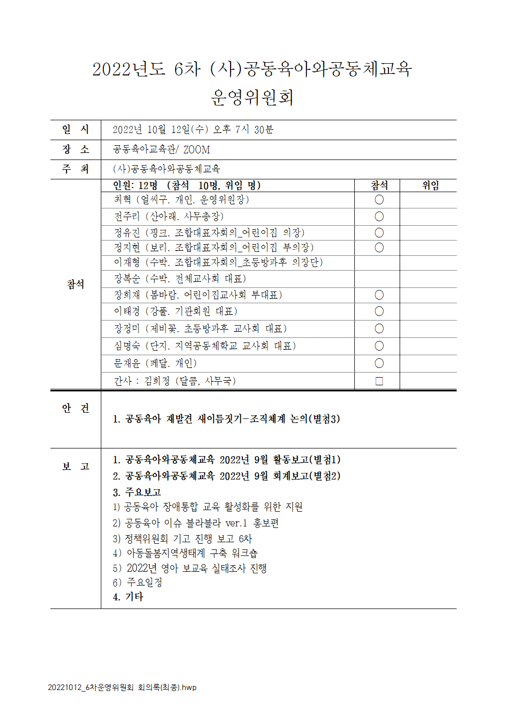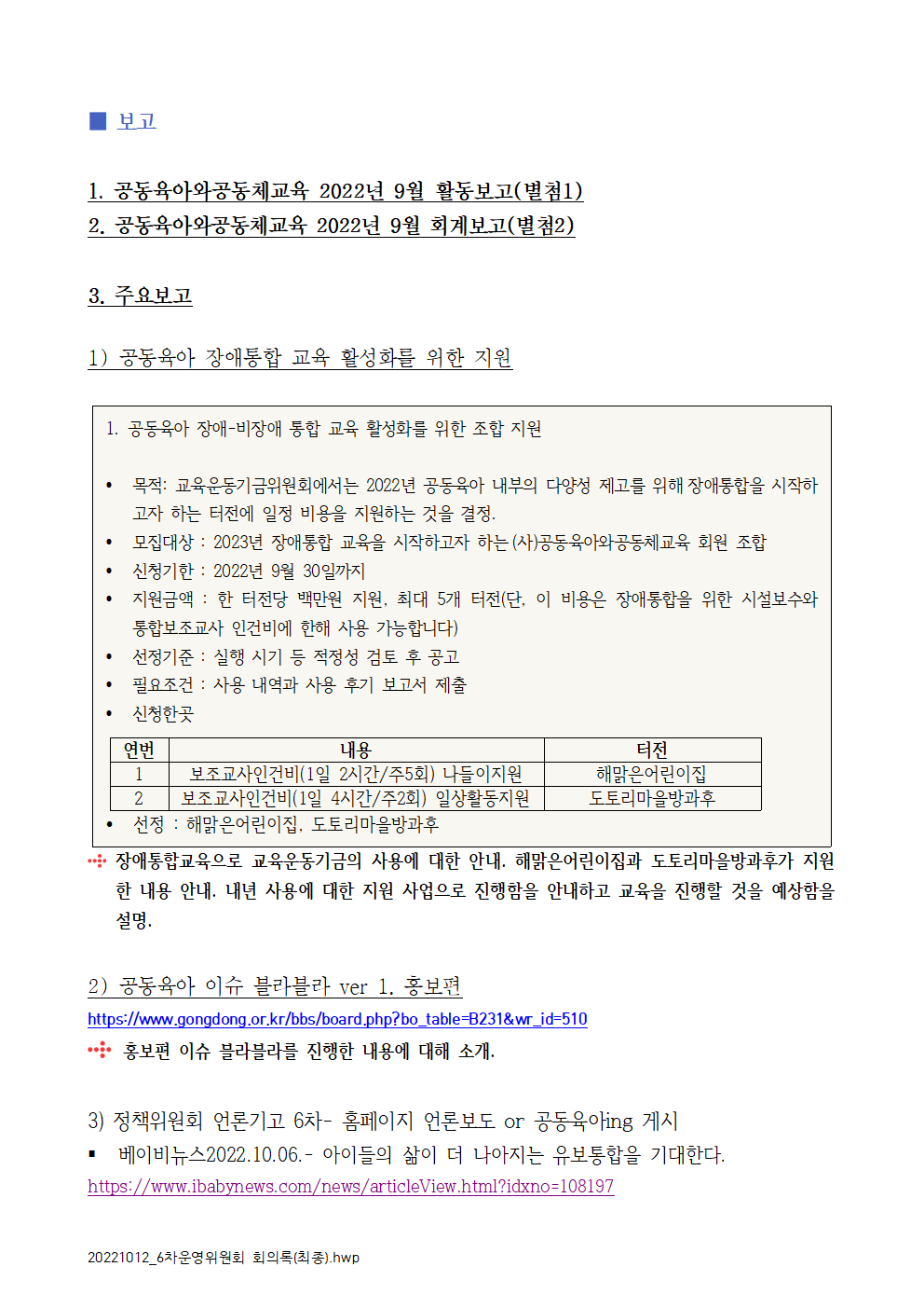 (사)공동육아와공동체교육 10월 운영위원회 결과 보고드립니다. (9월 활동보고, 9월 회계보고 별첨)