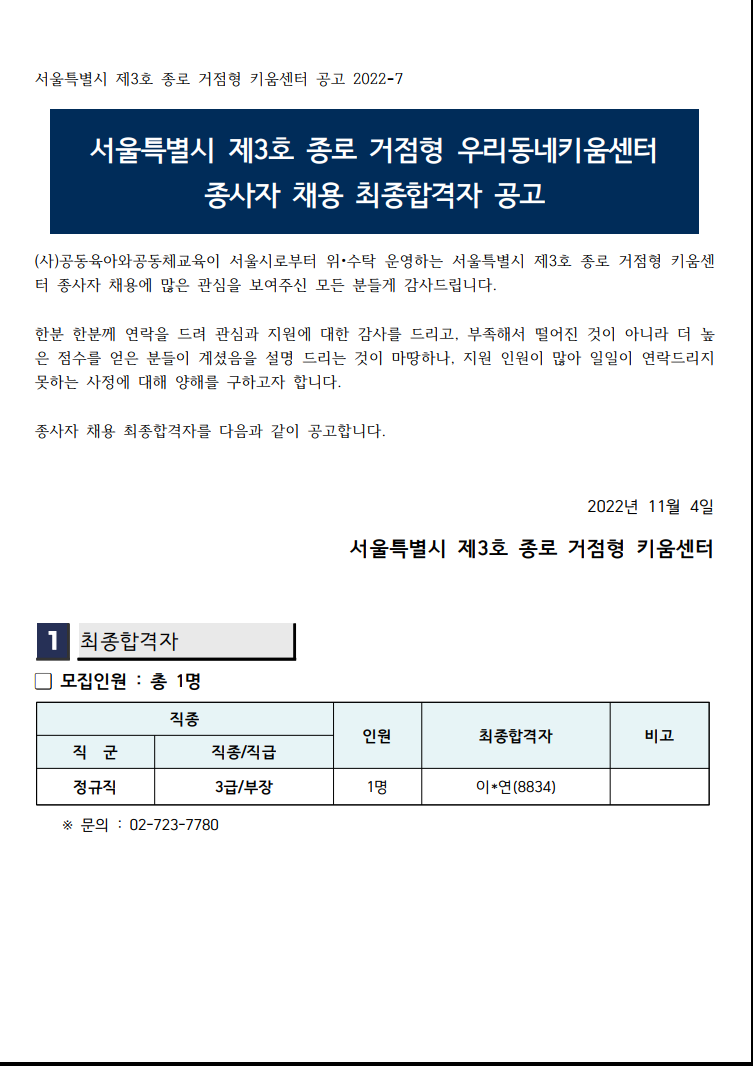서울시 제3호 종로 거점형 키움센터 채용 결과 공고(3급, 부장) 페이지 정보 작성자 운영자 작성일22-11-04 10:54 조회993회 본문 댓글목록 등록된 댓글이 없습니다. 이전글 다음글 목록