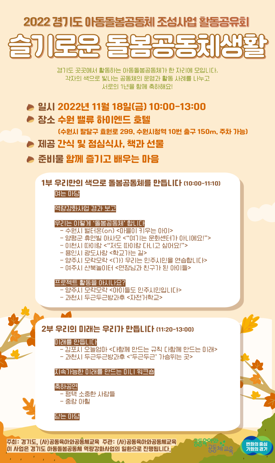 경기도 아동돌봄공동체 활동공유회 "슬기로운 돌봄공동체 생활" 출연진 공개합니다. 페이지 정보 작성자 운영자 작성일22-11-13 23:00 조회844회 본문 댓글목록 등록된 댓글이 없습니다. 이전글 다음글 목록