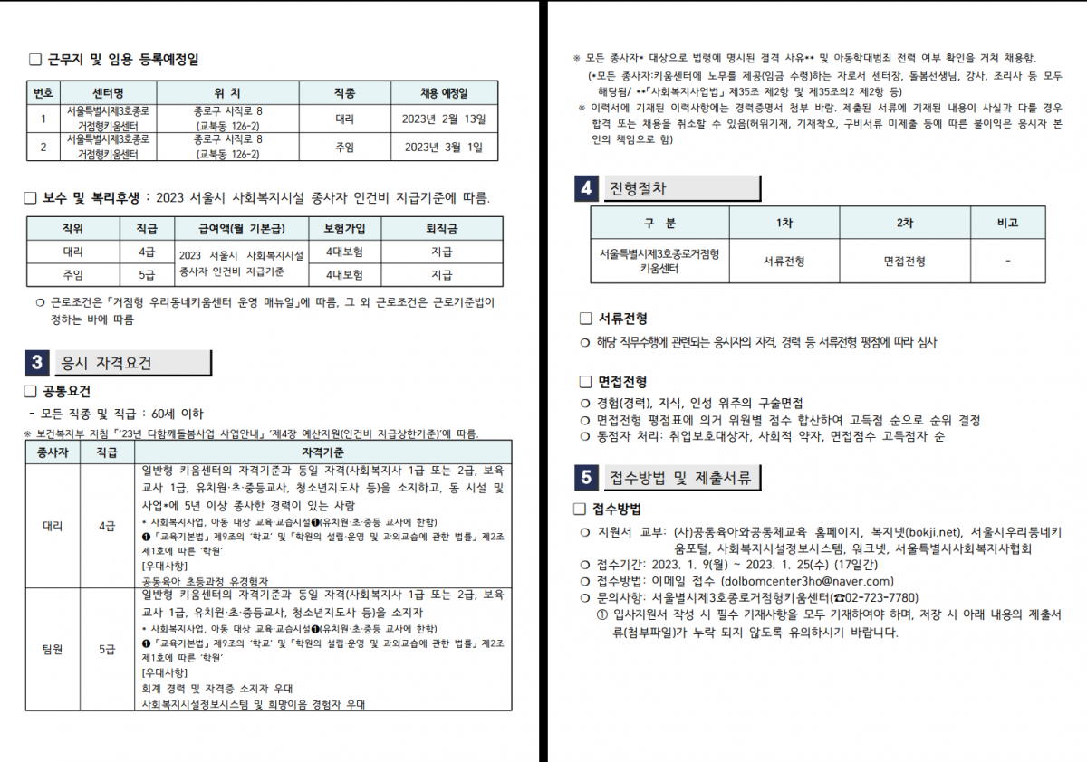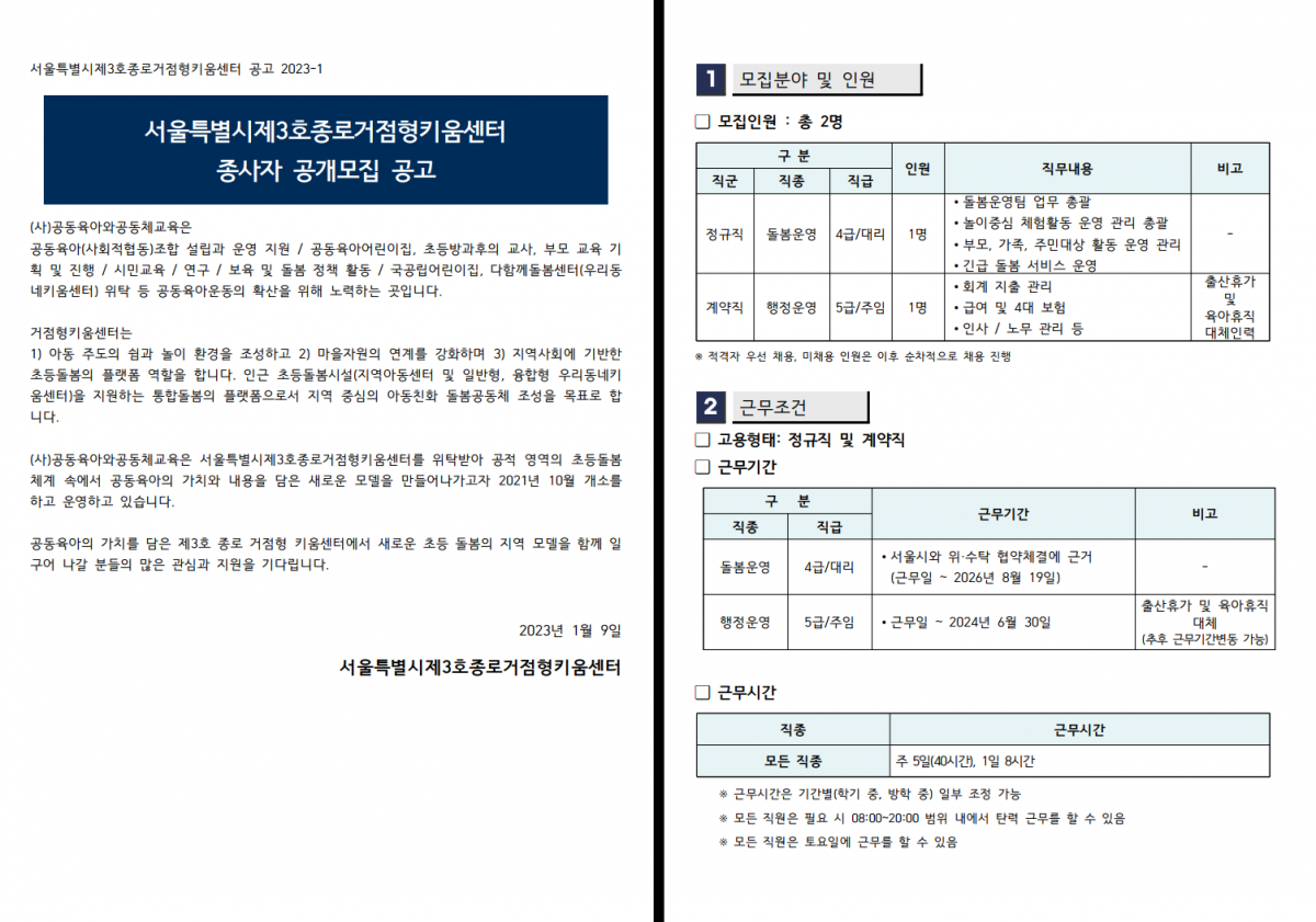 서울특별시 제3호 종로 거점키움센터 채용 공고(대리 1인, 주임 1인)