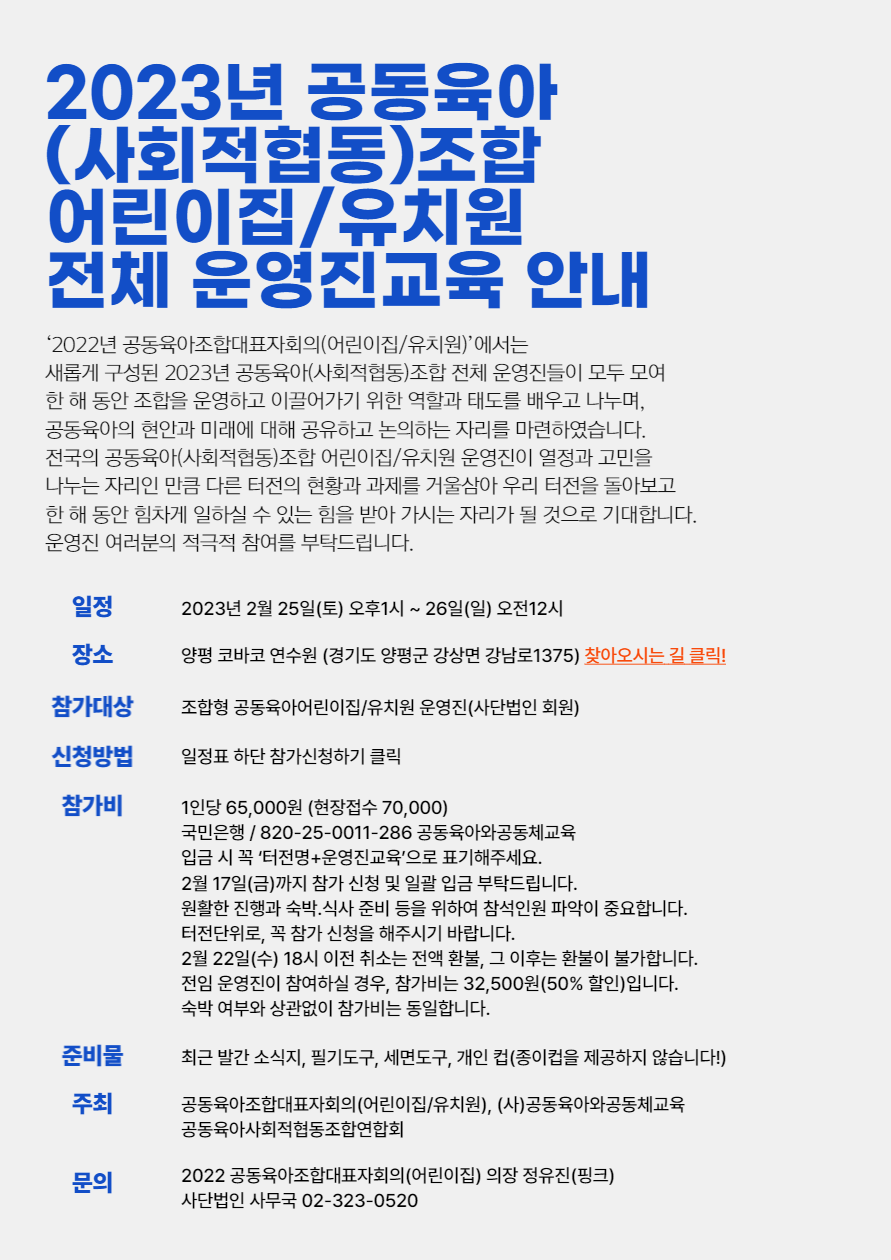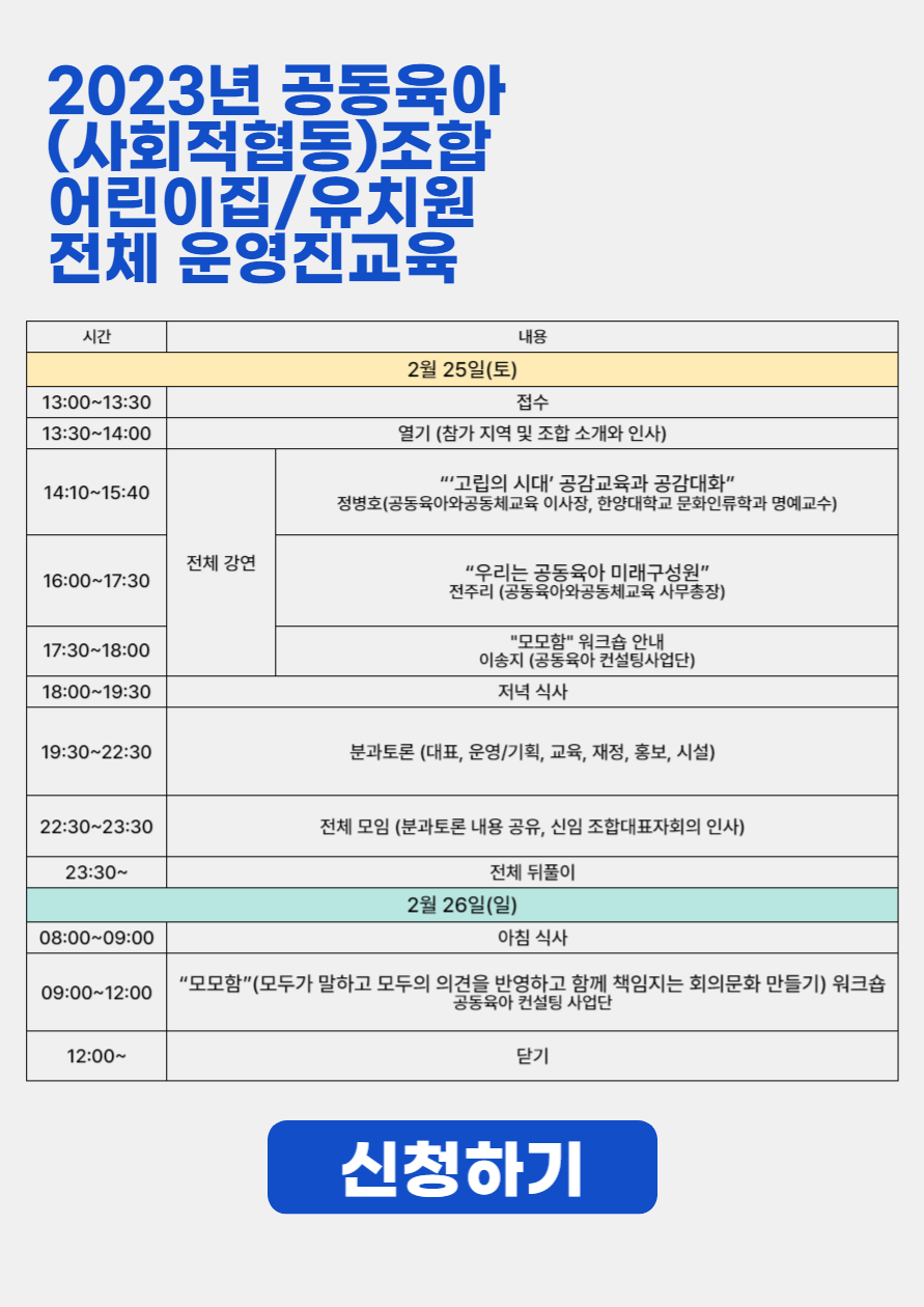 2023년 공동육아 (사회적협동)조합 어린이집/유치원 전체 운영진교육 안내 페이지 정보 작성자 운영자 작성일23-01-26 18:18 조회2,177회 본문 댓글목록 등록된 댓글이 없습니다. 이전글 다음글 목록