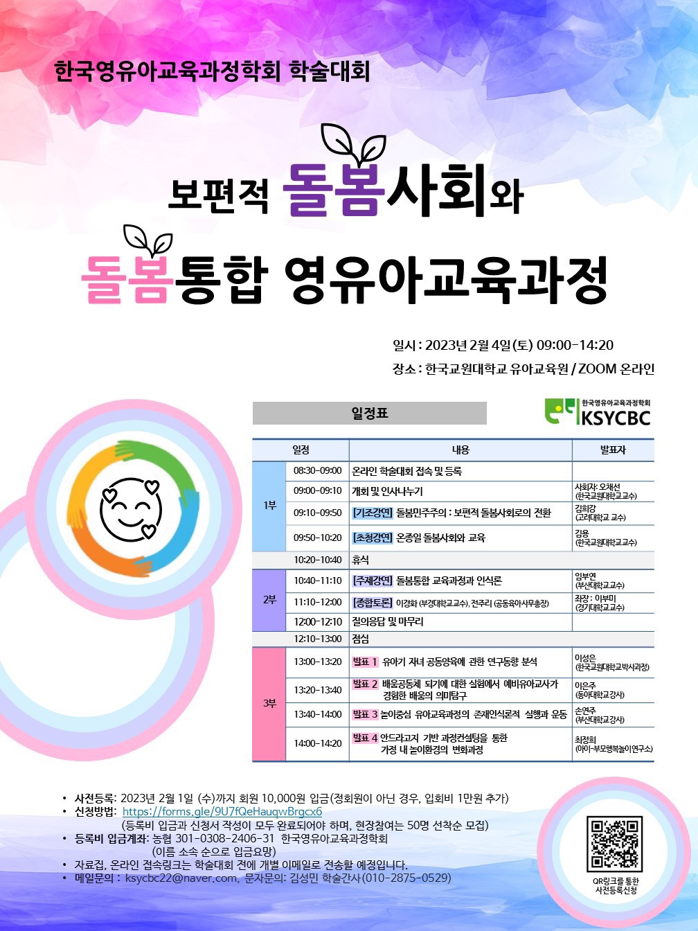 [한국영유아교육과정학회 학술대회] 보편적 돌봄사회와 돌봄통합 영유아 교육과정 페이지 정보 작성자 운영자 작성일23-02-03 05:58 조회877회 본문 유보통합을 위한 핫이슈 돌봄과 교육을 토론하는 자리입니다.한국영유아교육과정학회(전비평학회) 학술대회에 공동육아가 토론으로 함께합니다. 댓글목록 등록된 댓글이 없습니다. 이전글 다음글 목록