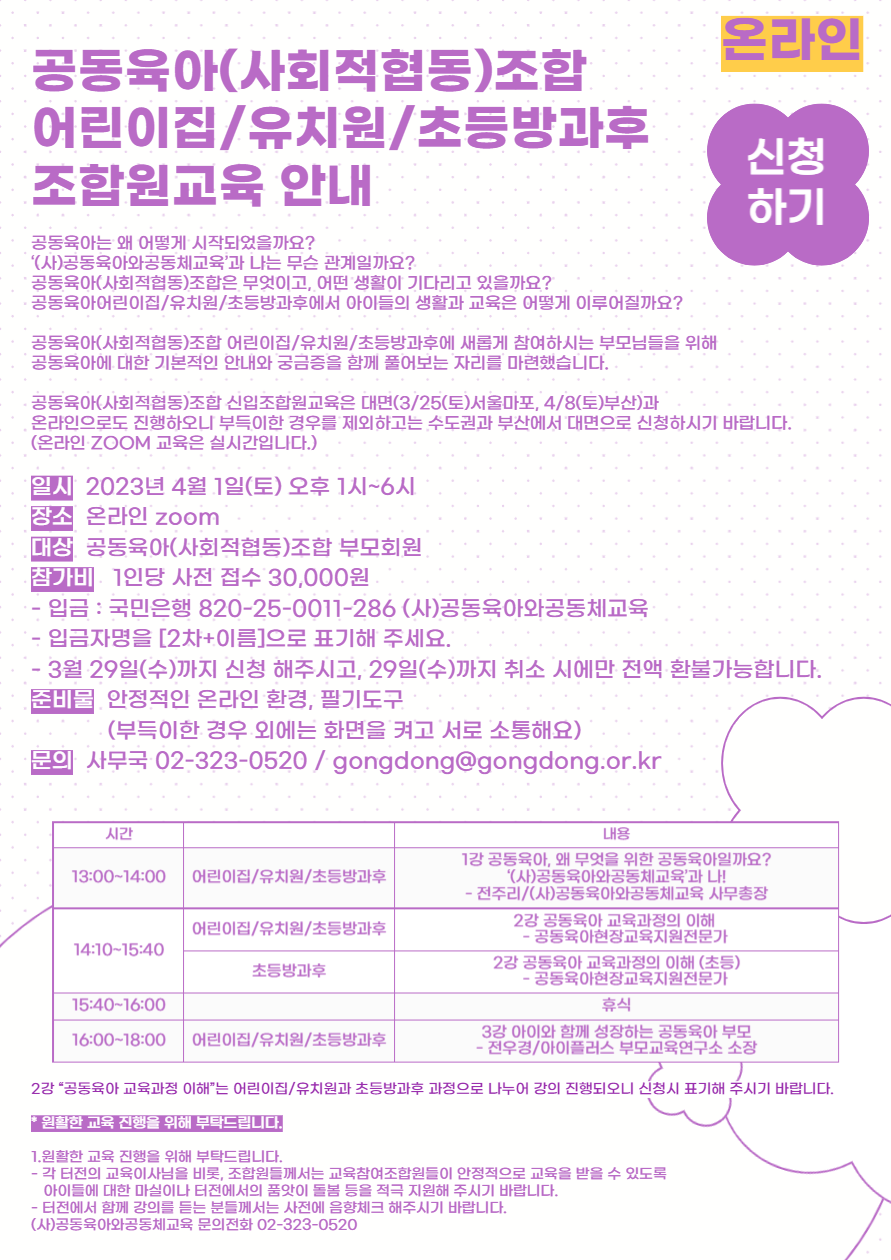 공동육아(사회적협동)조합 어린이집/유치원/초등방과후 신입+전체조합원교육 안내4/1(토)_온라인zoom 페이지 정보 작성자 운영자 작성일23-03-06 15:57 조회1,533회 본문 댓글목록 등록된 댓글이 없습니다. 이전글 다음글 목록