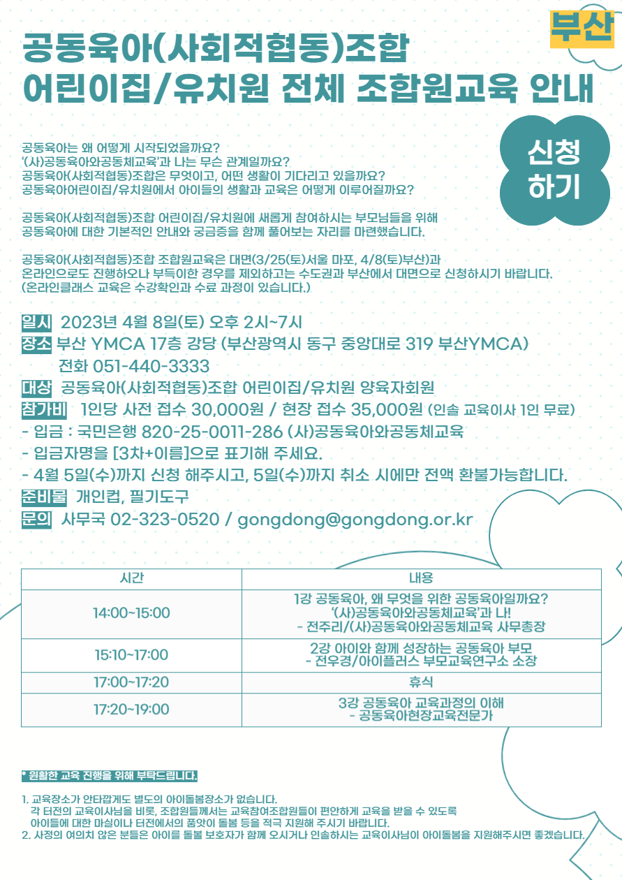 공동육아(사회적협동)조합 어린이집/유치원 신입+전체조합원교육 안내4/8(토)_부산 페이지 정보 작성자 운영자 작성일23-03-06 16:01 조회1,048회 본문 댓글목록 등록된 댓글이 없습니다. 이전글 다음글 목록