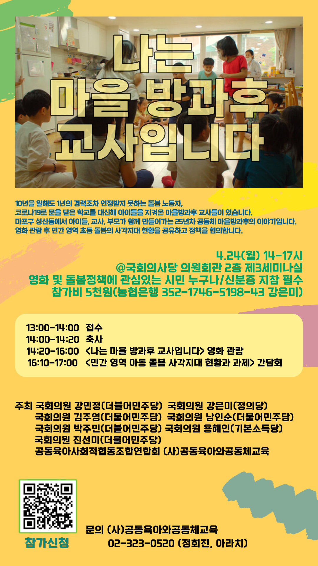 4/24 <나는 마을방과후 교사입니다>가 국회 상영 및 간담회에 함께 해 주세요! (재공지-참가비 책정된 내용 확인…