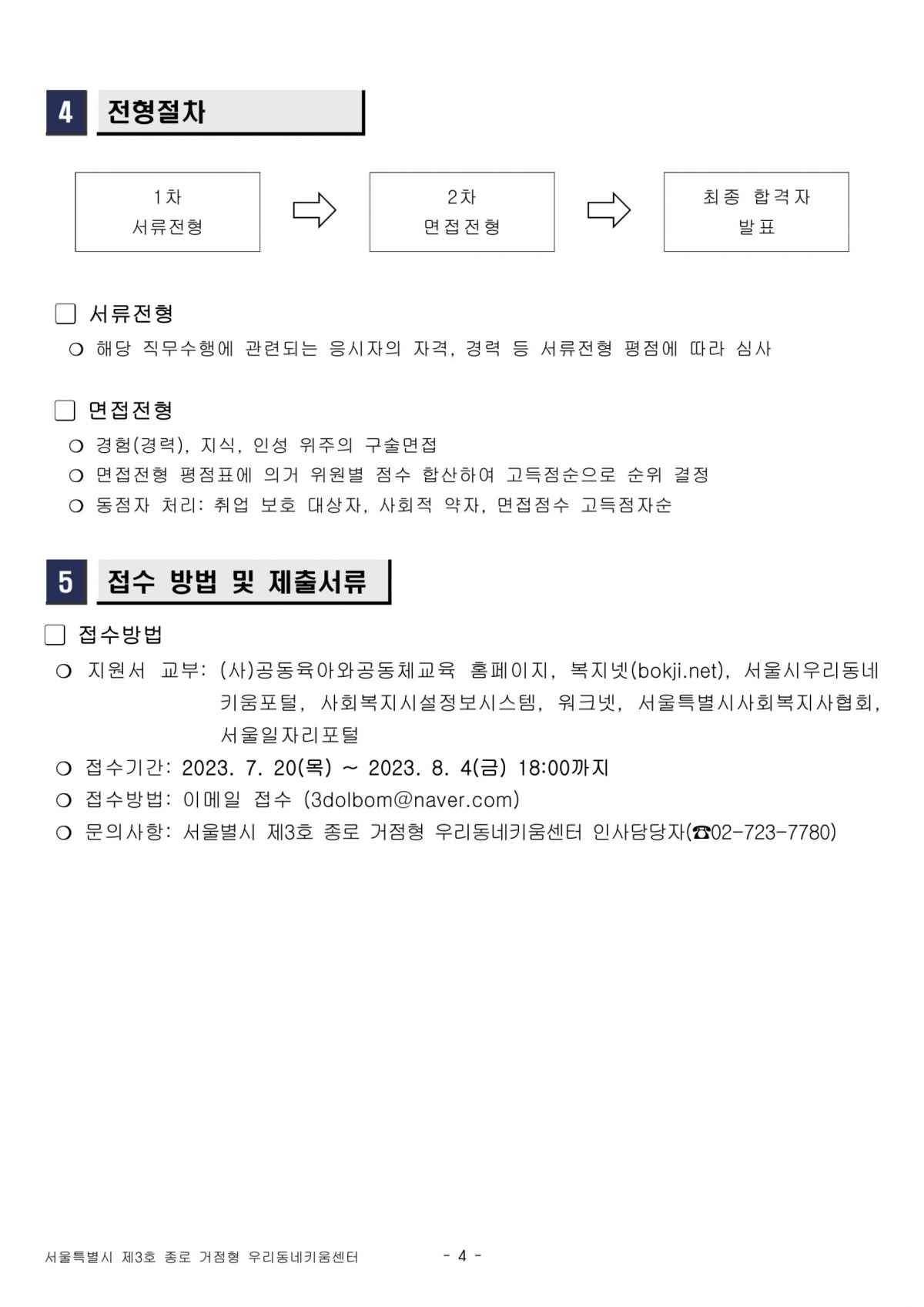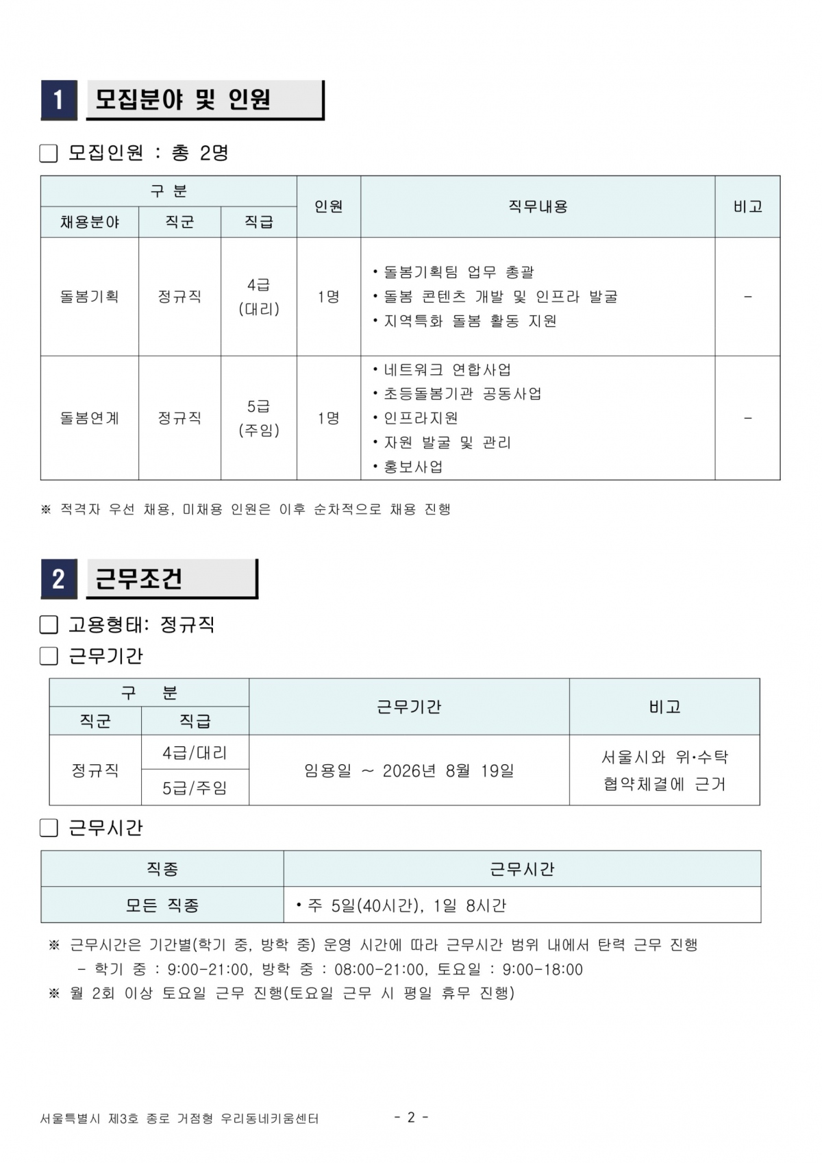 서울특별시 제3호(종로) 거점형 키움센터 종사자 채용 공고(2인/ 4급, 5급)