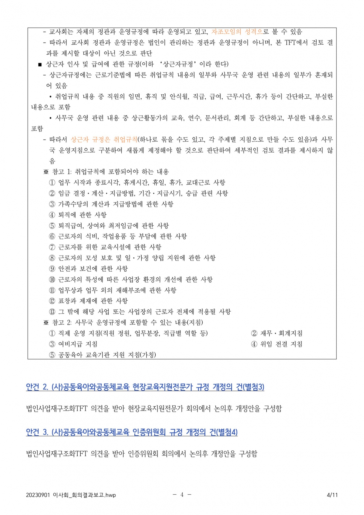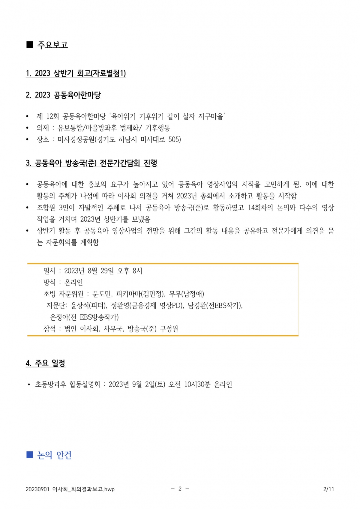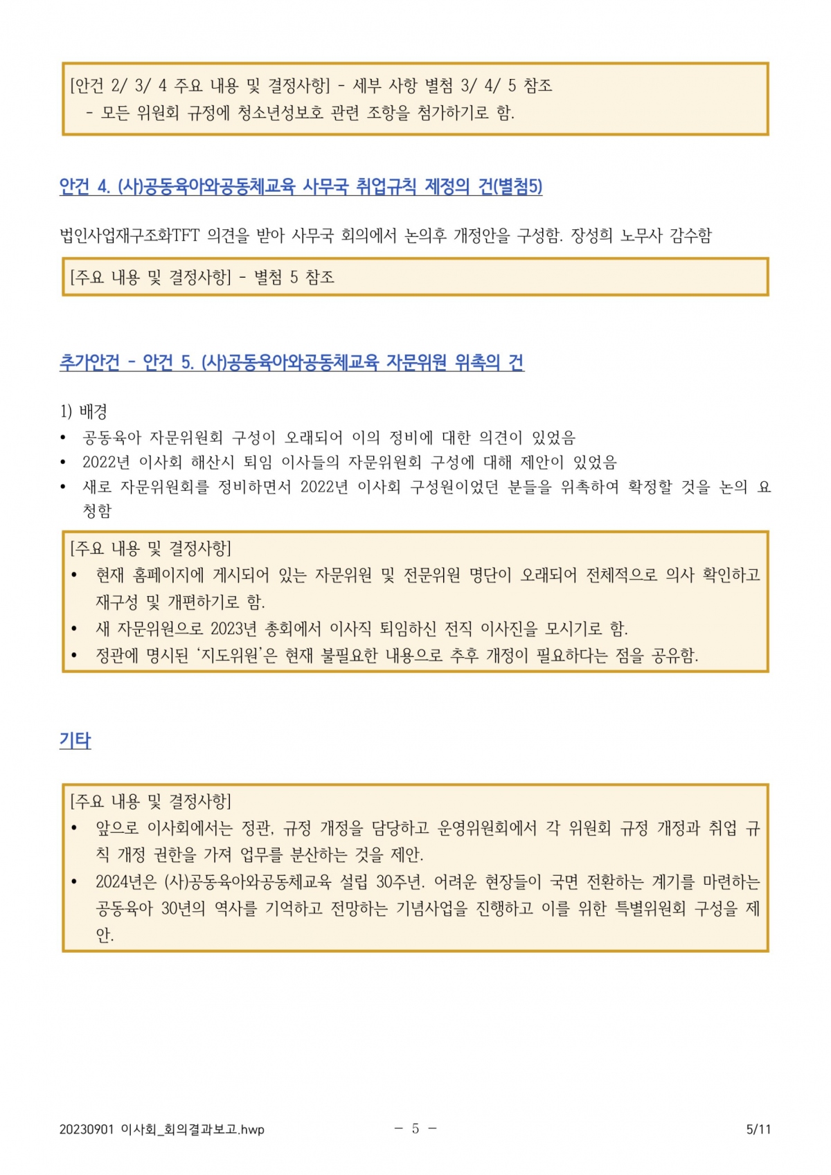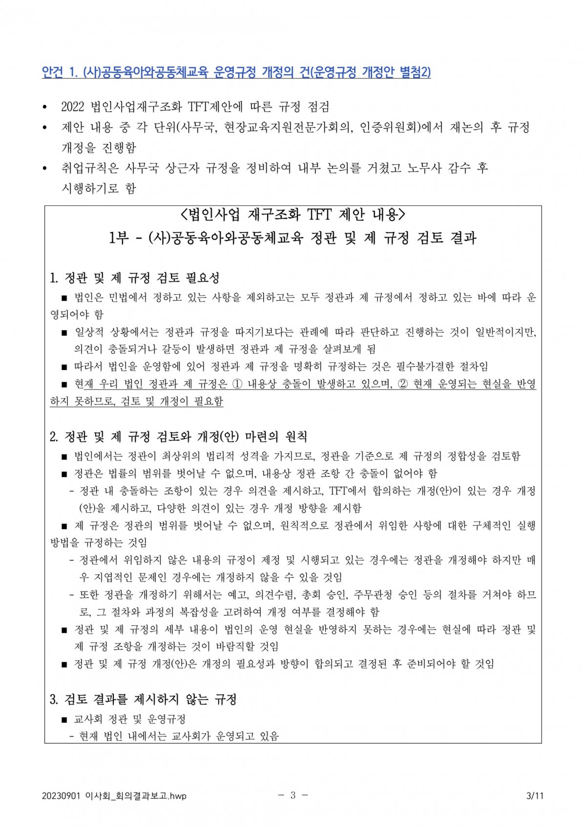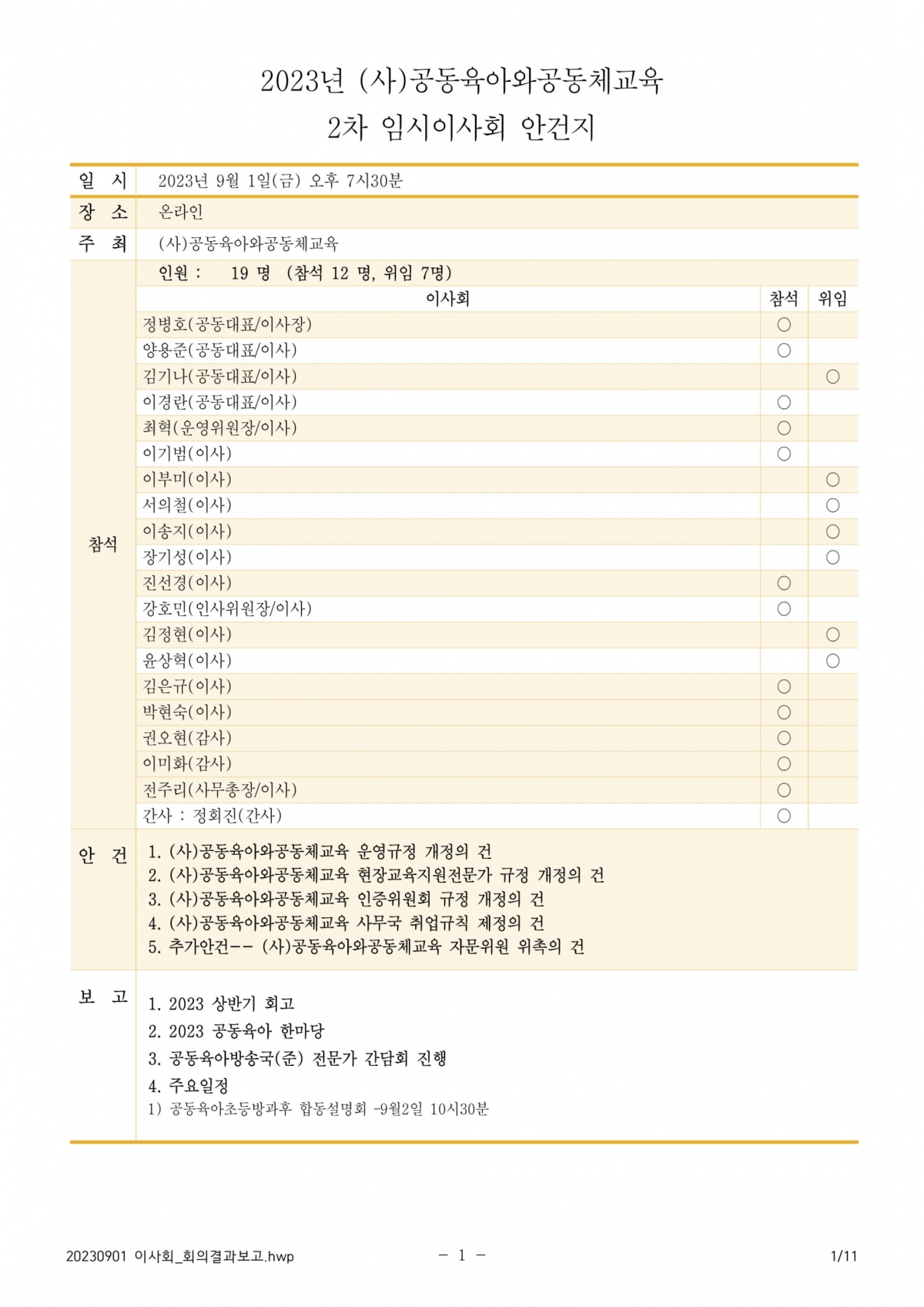 (사)공동육아와공동체교육 2023년 9월 임시 이사회 결과 보고 드립니다.