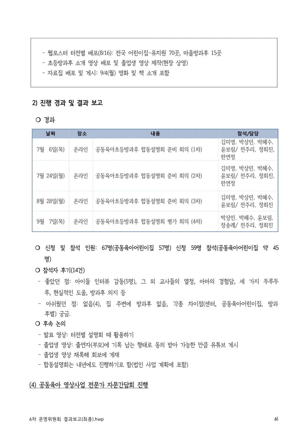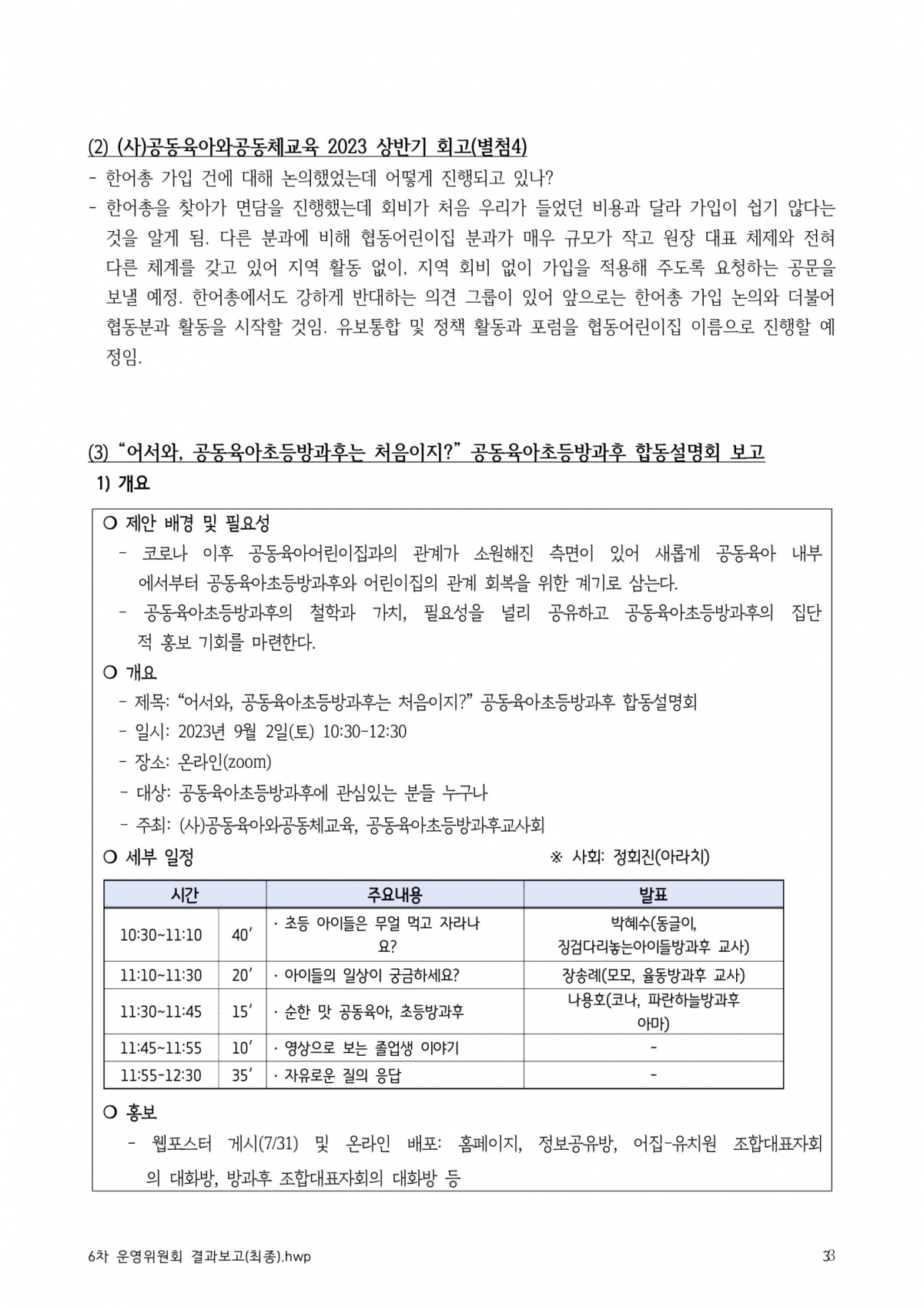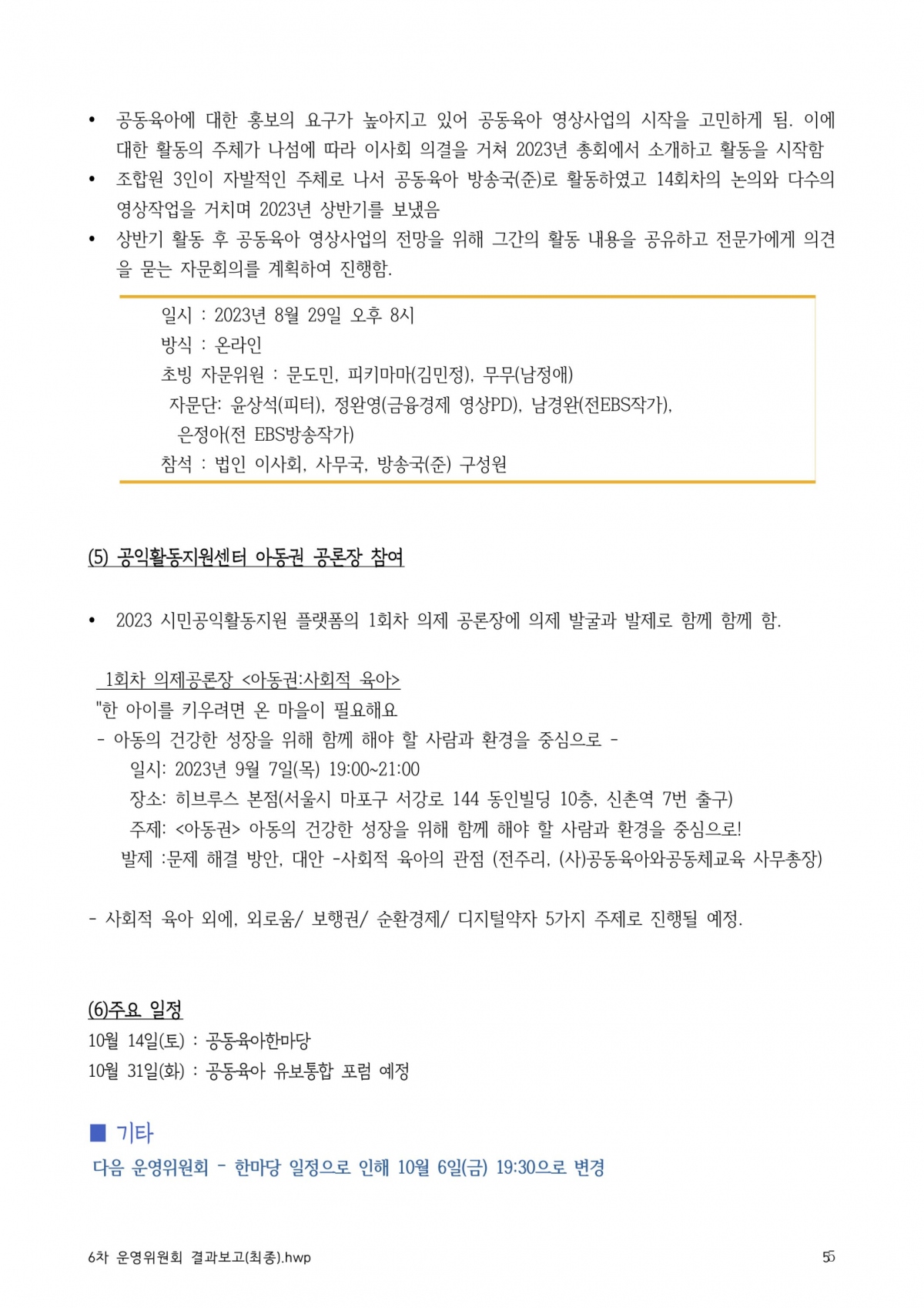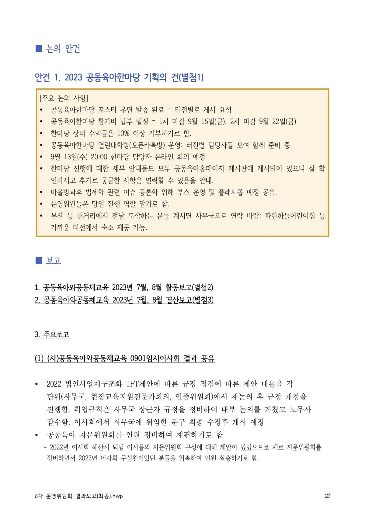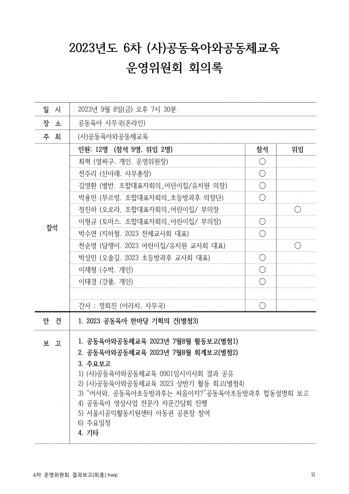 9월 8일(금) 6차 운영위원회 결과 보고 드립니다. (7-8월 활동 보고 및 결산 보고 포함)