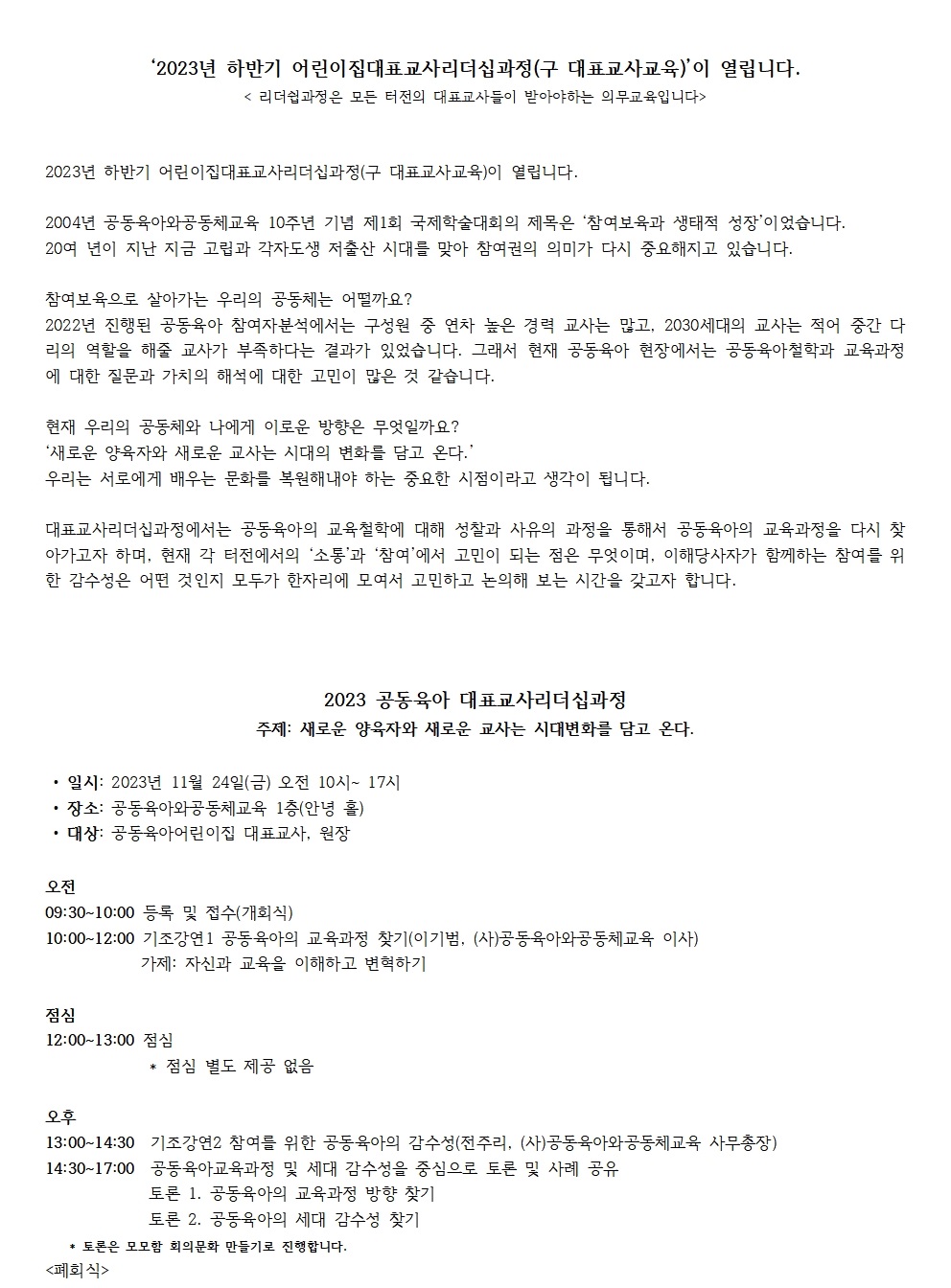 [공동육아교육연구원] 2023년 하반기 어린이집대표교사리더쉽과정(구 대표교사교육)을 진행합니다.