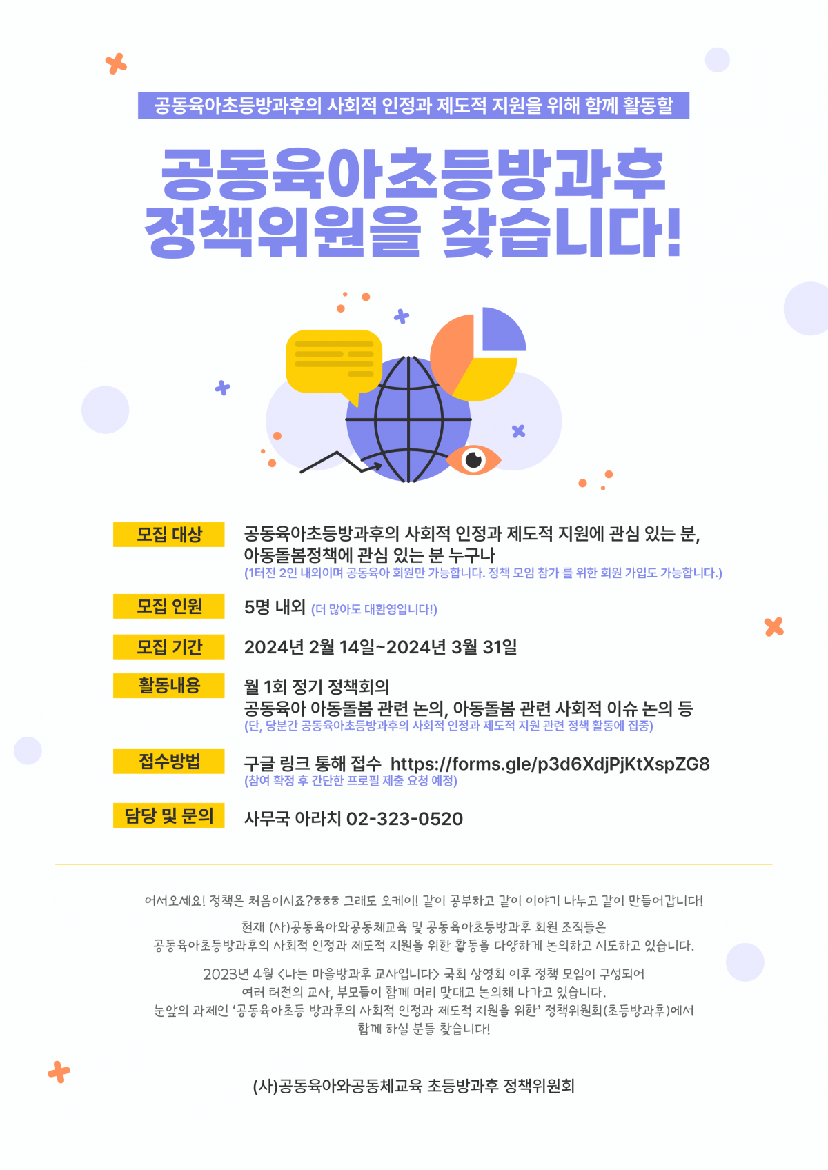 공동육아초등방과후의 사회적 인정과 제도적 지원을 위해 함께 하실 정책위원을 찾습니다!