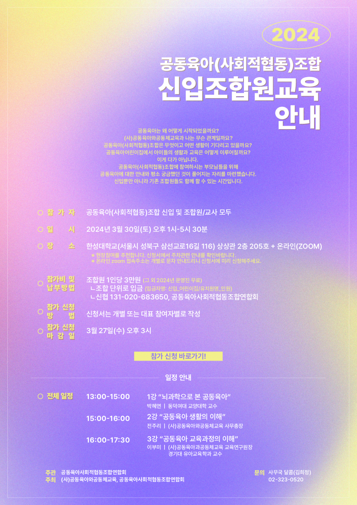 2024년 공동육아(사회적협동)조합 신입조합원교육 안내 페이지 정보 작성자 운영자 작성일24-02-21 15:54 조회1,630회 본문 댓글목록 등록된 댓글이 없습니다. 이전글 다음글 목록
