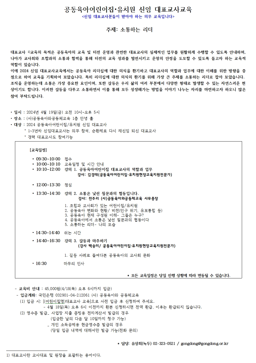 [공동육아교육연구원] 2024 어린이집/유치원 신임 대표교사교육을 진행합니다.