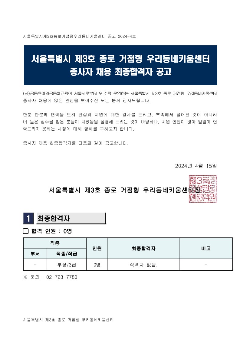 서울시 제3호(종로) 거점형 키움센터 종사자 채용 합격자 공고(적격자 없음)