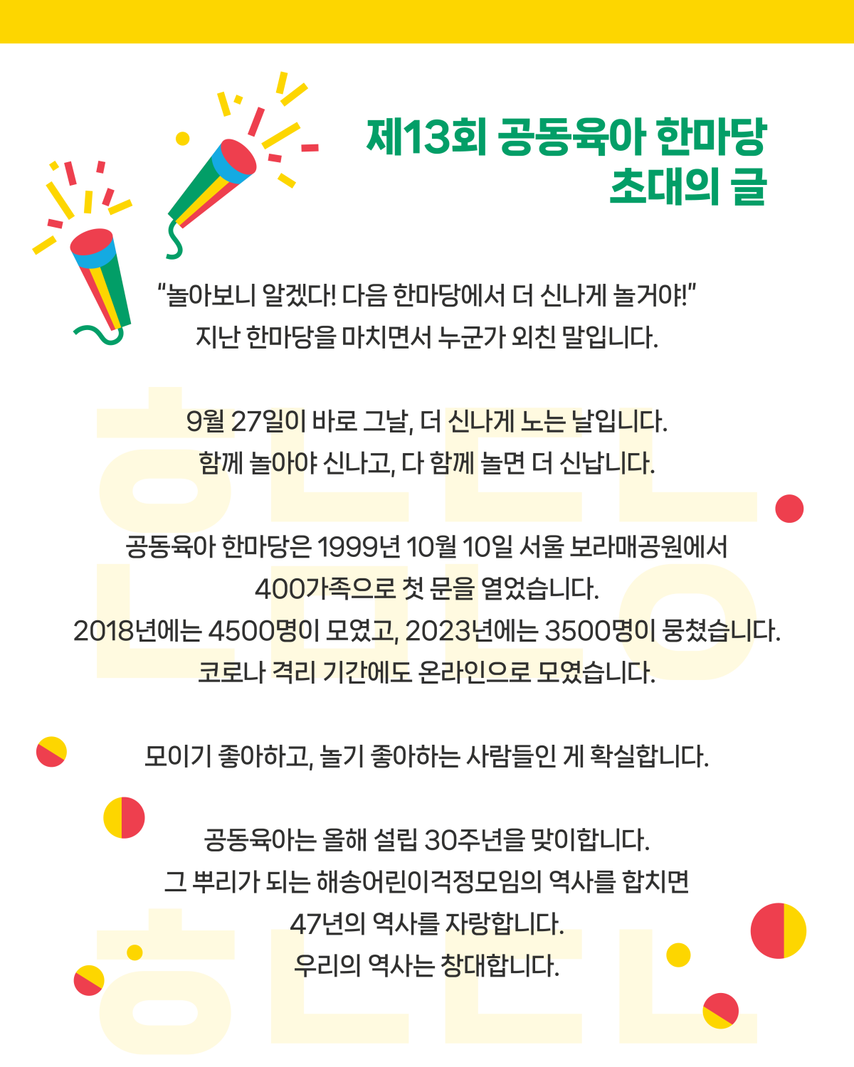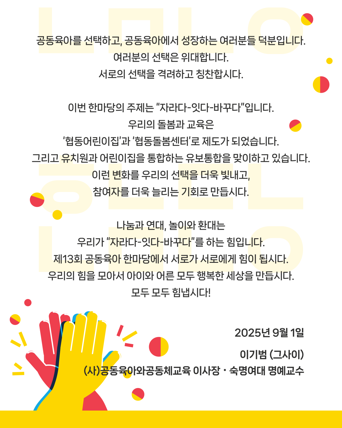 [2025 공동육아 한마당] 초대의 글 : (사)공동육아와공동체교육 이사장 이기범 페이지 정보 작성자 운영자 작성일25-09-01 16:29 조회469회 본문 댓글목록 등록된 댓글이 없습니다. 이전글 다음글 목록