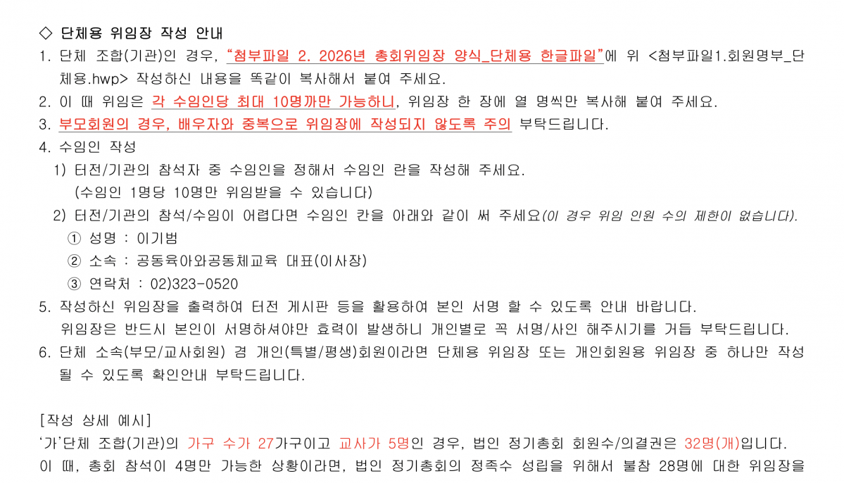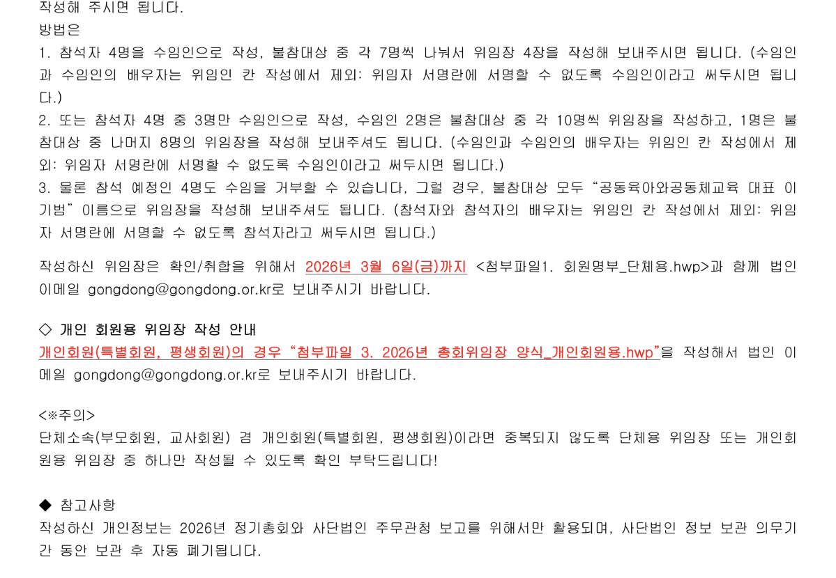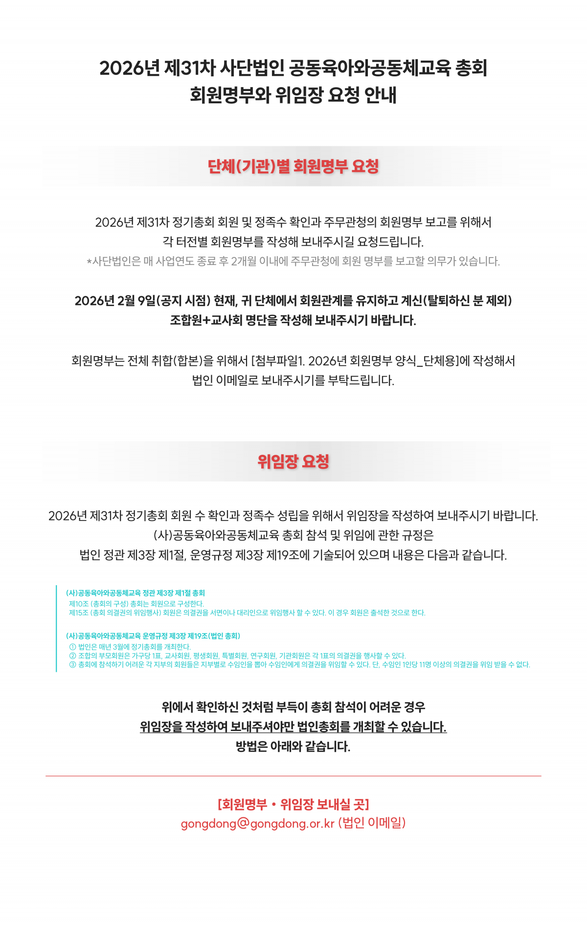 2026년 제31차 사단법인 공동육아와공동체교육 정기총회 1차 안내(회원명부・위임장 요청)