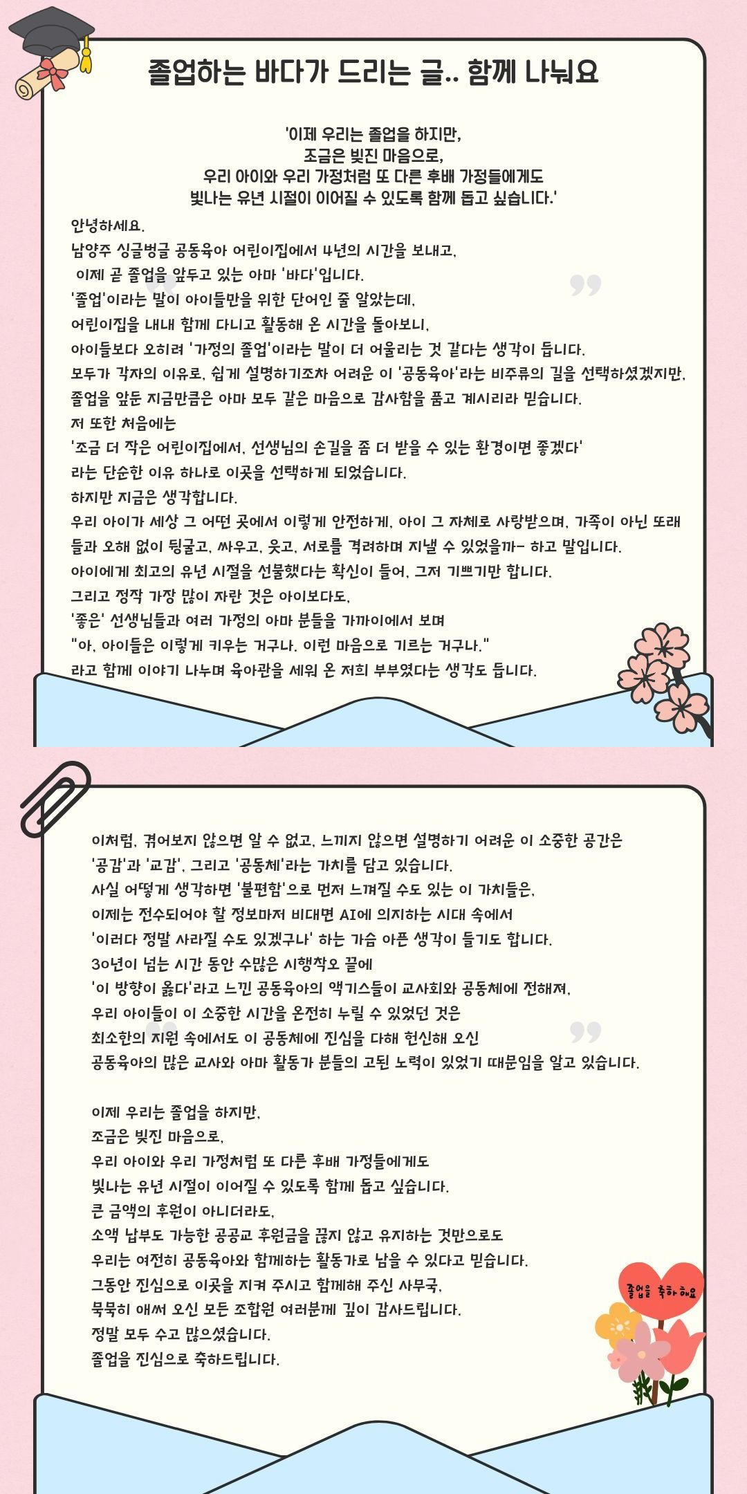 아울러 졸업 후에도 모든 아이들을 위한 공동육아 후원에 계속 함께하실 수 있음을 안내드립니다.
