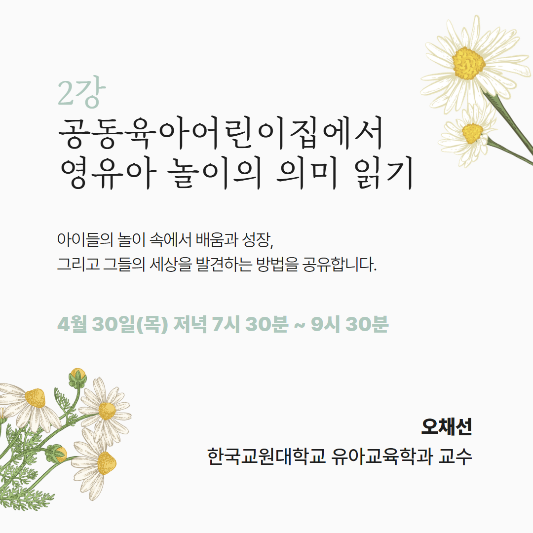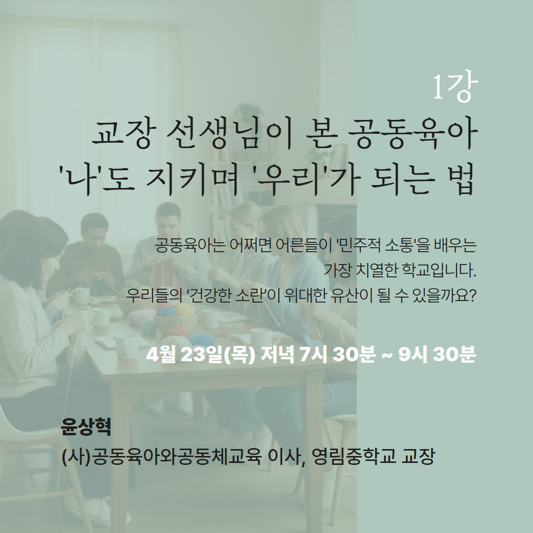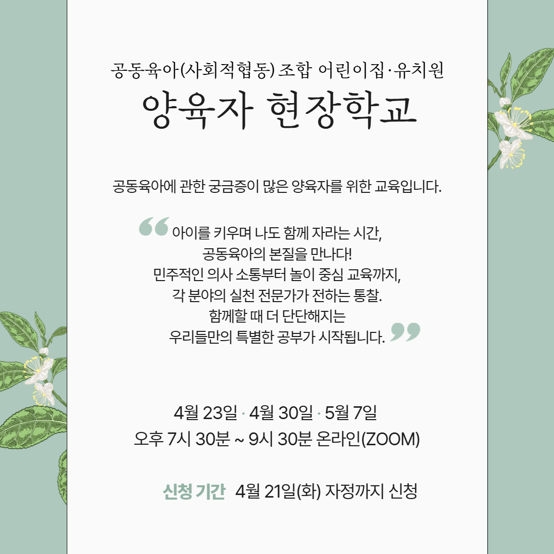 2026 공동육아(사회적협동)조합 어린이집·유치원 양육자 현장학교 안내 페이지 정보 작성자 운영자 작성일26-03-11 16:24 조회913회 본문 댓글목록 등록된 댓글이 없습니다. 이전글 다음글 목록