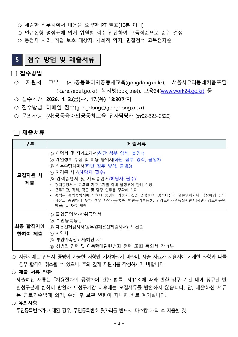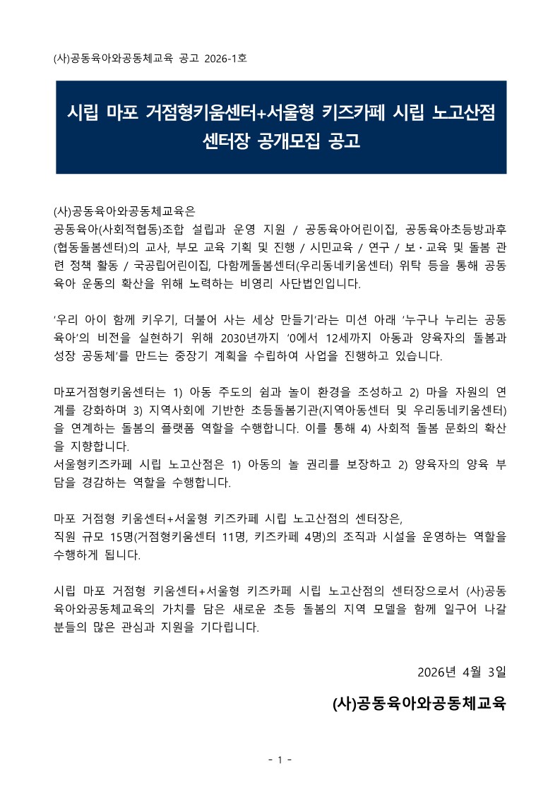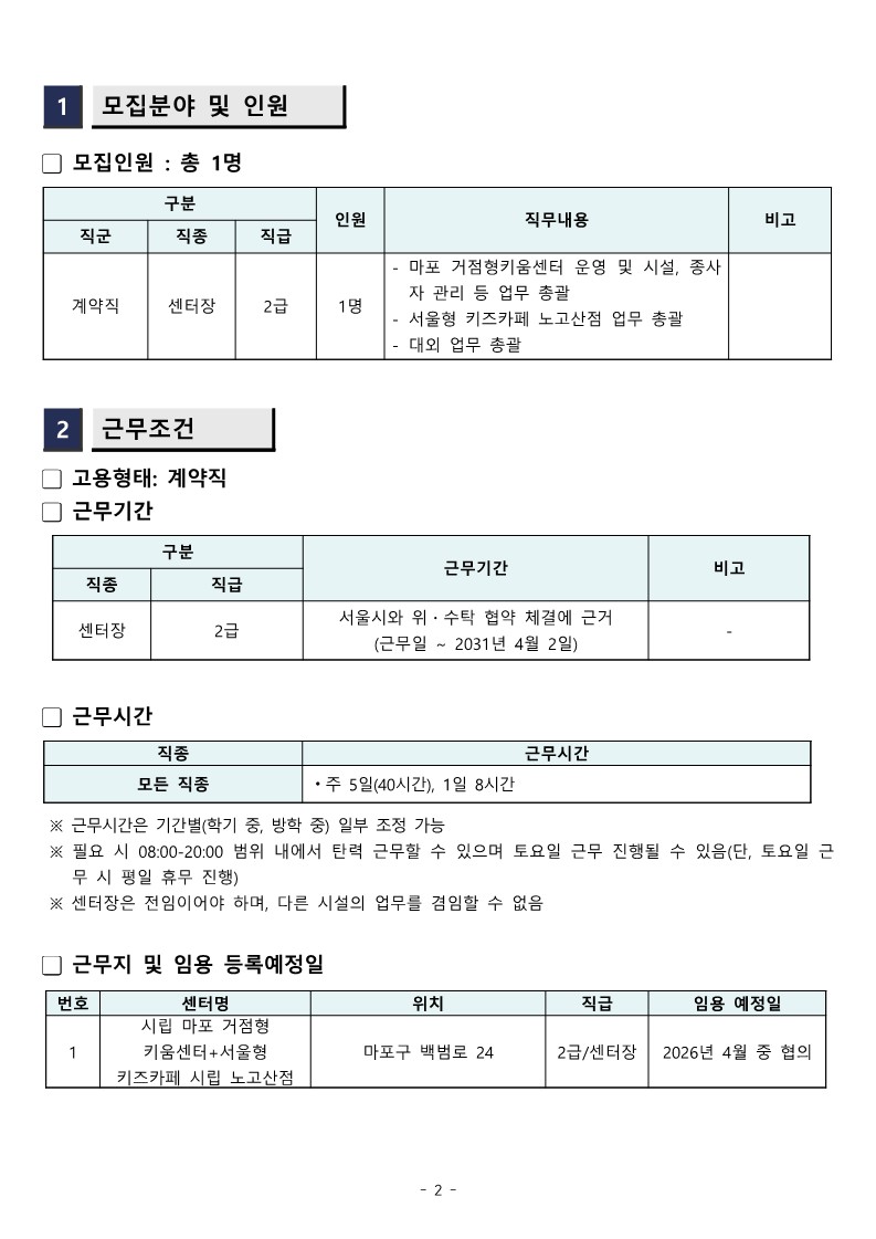 시립 마포 거점형키움센터+서울형 키즈카페 시립 노고산점 센터장 공개 모집 공고(~4/17)