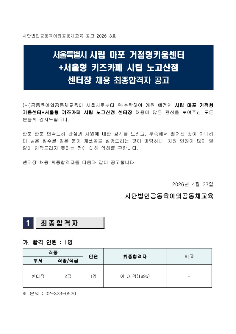 시립 마포구 거점형키움센터 + 서울형 키즈카페 노고산점 센터장 채용 최종 합격자 공고 페이지 정보 작성자 운영자 작성일26-04-23 16:42 조회24회 본문 댓글목록 등록된 댓글이 없습니다. 다음글 목록