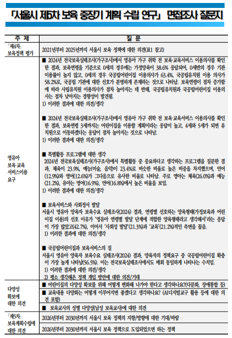 2025년 6월에는 "서울시 제5차 보육 중장기 계획 수립 연구" 관련 보육교사 및 양육자 면접조사 참여 제안"