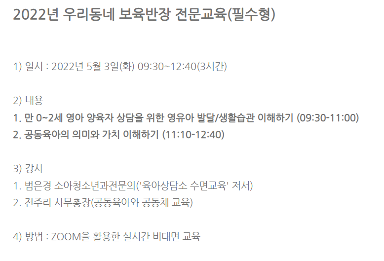 서울시 육아종합지원센터에서 진행하는 우리동네 보육반장 필수교육에 함께하였습니다.