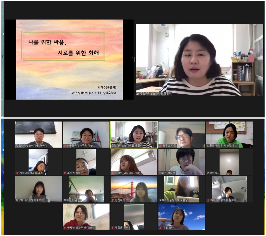 코로나로 인해 많은 것들이 달라지는 속에서 비대면으로 진행되는 상황에 좀 아쉬웠지만 그럼에도 불구하고 함께하는 동료 교사들이 있다는 것에 대한 감사함과 소중함을 다시금 깨닫는 시간이 되었습니다. 비대면 교사대회이었지만 화면 속에서는 보이지 않는 연대를 느낄 수 있었고 특히 제주도의 방과후 교사들과 함께할 수 있어서 더욱 좋은 시간이 되었습니다.