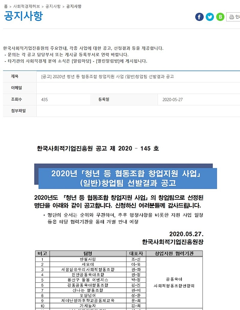 한국사회적기업진흥원의 '2020년 청년 등 협동조합 창업지원사업'을 진행합니다.