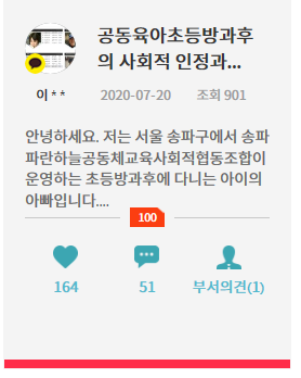 곧 공동육아초등방과후의 청원과 요구뿐만 아니라, 천만 서울 시민이 함께 공감하고 논의할 수 있는 공동육아 초등돌봄의 가치를 담은 카드뉴스가 제작되어 나오면 시민 공론장에서 토론이 시작될 예정입니다.