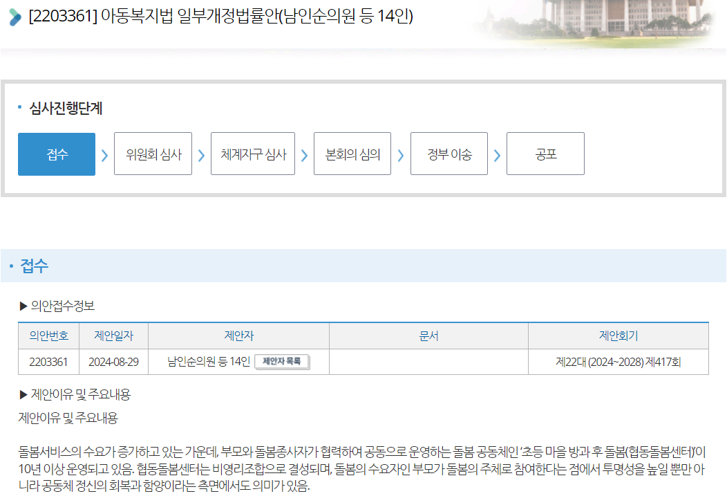 지난 21대 국회에서도 같은 취지로 공동육아초등방과후의 법제화를 위해 아동복지법 개정안을 발의한 바 있으나,