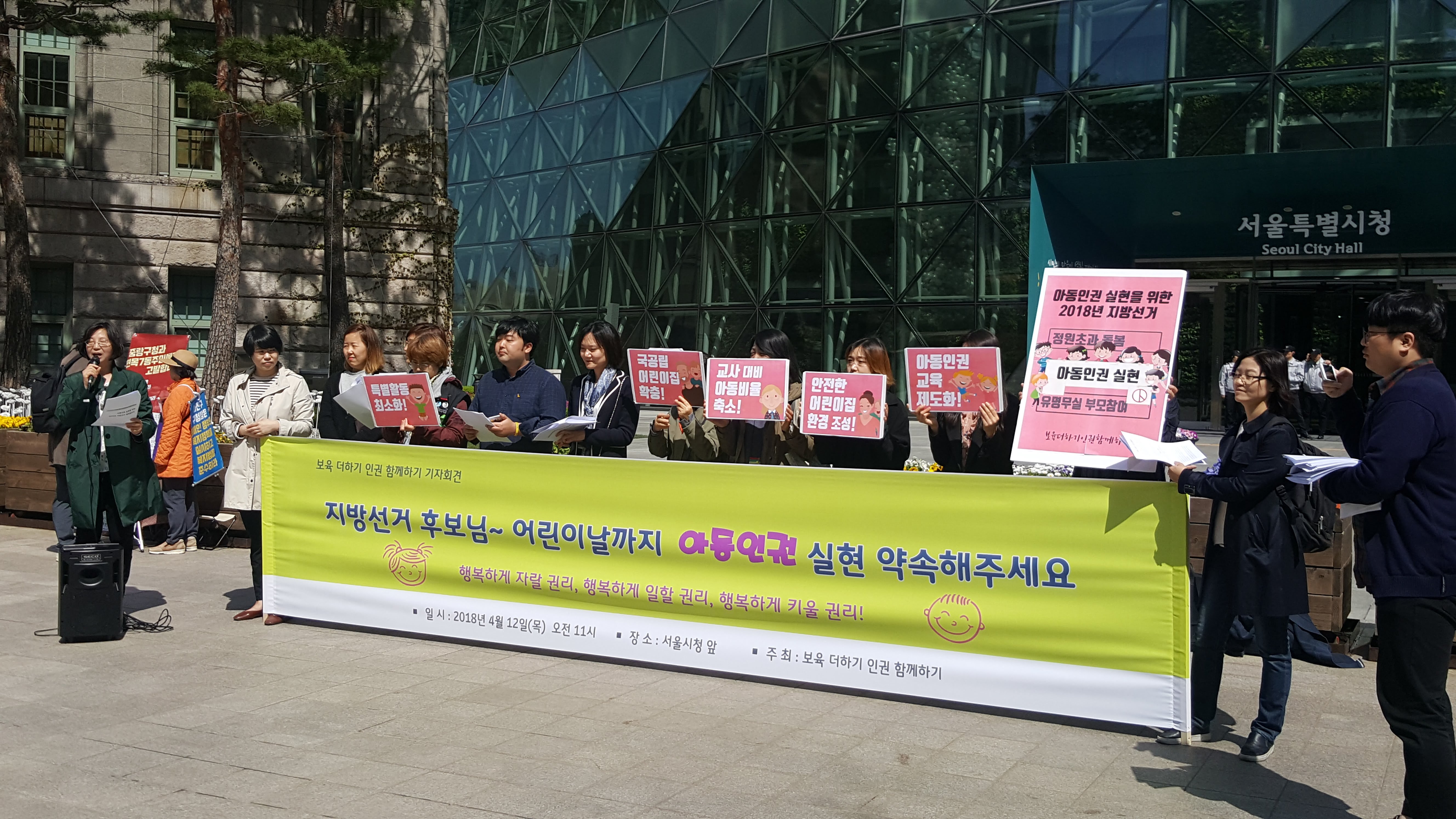 4월12일 오전 서울시청앞에서 23개 시민사회단체·노동조합으로 구성된 '보육 더하기 인권 함께하기'는