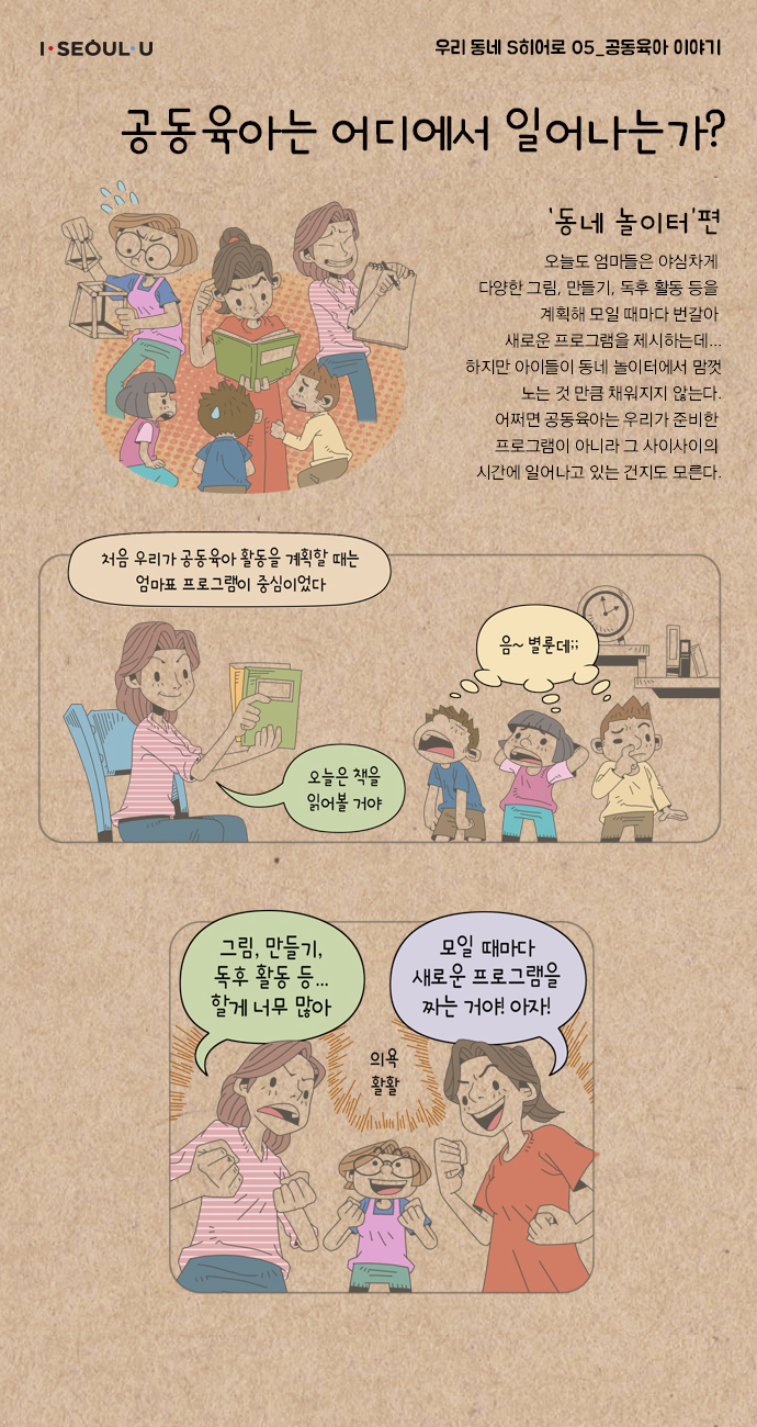 * 우리동네 S히어로는 서울 히어로(Seoul Hero), 슈퍼 히어로(Super Hero)를 뜻하는 것으로 마을의 문제를 지혜롭게 해결한 주민들의 사례를 엮어서 매년 발간하는 서울시 마을공동체 사례집입니다. 2018년 우리 동네 S히어로 5편은 <공동육아 이야기>로 제작되어 총 9회에 걸쳐 연재되었습니다.