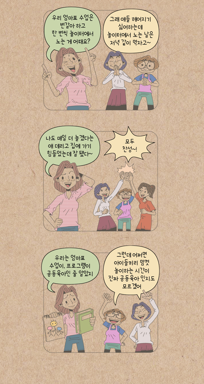서울시에서 공동육아 활동의 이해를 돕기 위한 웹툰을 제작하였고 공동육아의 경험담은 (사)공동육아와공동체교육 공동육아지원단을 통해 제공되었습니다. 공동육아를 하고 계신 분들, 관심 있는 분들에게 널리 공동육아를 알리고자 연재 중입니다. 오늘은 제4화!