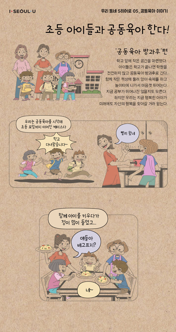 * 우리동네 S히어로는 서울 히어로(Seoul Hero), 슈퍼 히어로(Super Hero)를 뜻하는 것으로 마을의 문제를 지혜롭게 해결한 주민들의 사례를 엮어서 매년 발간하는 서울시 마을공동체 사례집입니다. 2018년 우리 동네 S히어로 5편은 <공동육아 이야기>로 제작되어 총 9회에 걸쳐 연재되었습니다.