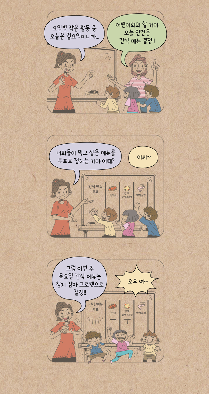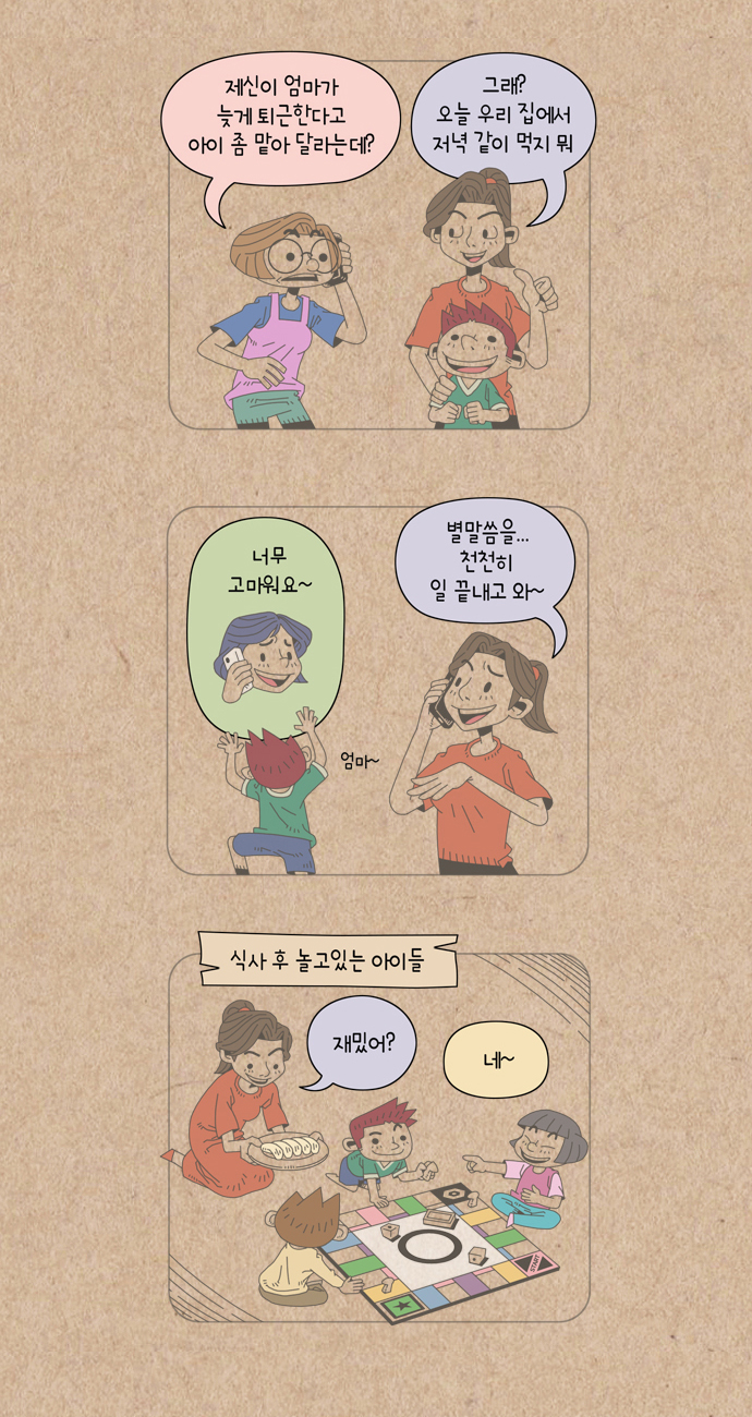 서울시에서 공동육아 활동의 이해를 돕기 위한 웹툰을 제작하였고 공동육아의 경험담은 (사)공동육아와공동체교육 공동육아지원단을 통해 제공되었습니다. 공동육아를 하고 계신 분들, 관심 있는 분들에게 널리 공동육아를 알리고자 연재 중입니다. 오늘은 제7화!