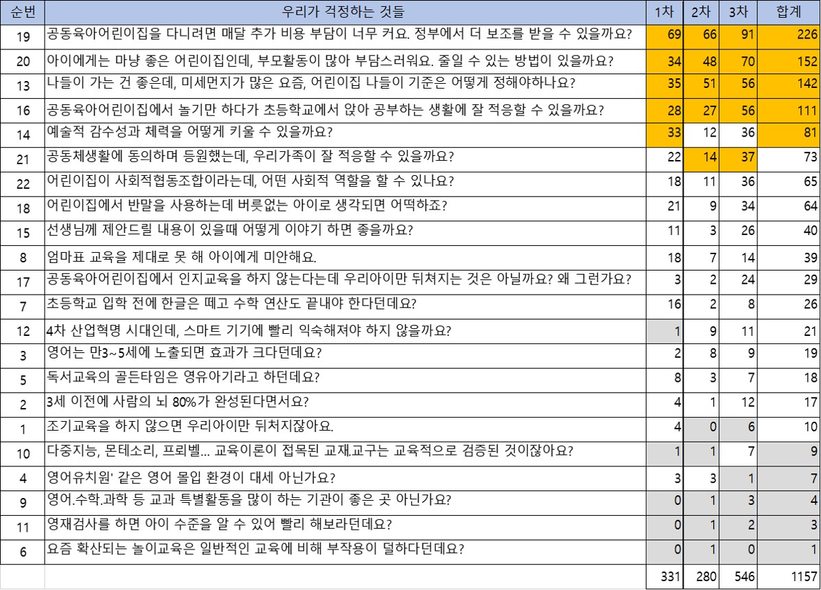 '우리가 걱정하는 것들'에 대한 스티커 투표를 하였고, 아래와 같이 1위: 조합비용부담, 2위: 부모활동, 3위: 미세먼지, 4위: 초등이후 생활로 집계되었습니다.